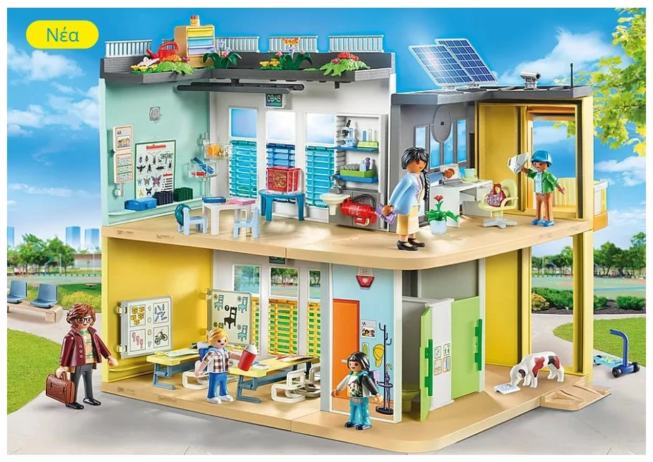 Με δύο αίθουσες διδασκαλίας, ασανσέρ και τουαλέτα. Στην ταράτσα του κτιρίου υπάρχουν φωτοβολταϊκά και όμορφα λουλούδια που φροντίζουν οι μαθητές. Ζωγραφίστε τις ειδικές ετικέτες με τον μαρκαδόρο νερού PLAYMOBIL (περιλαμβάνεται).