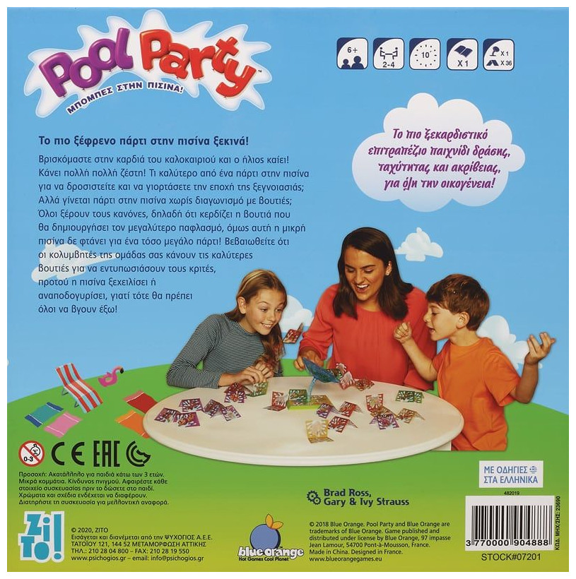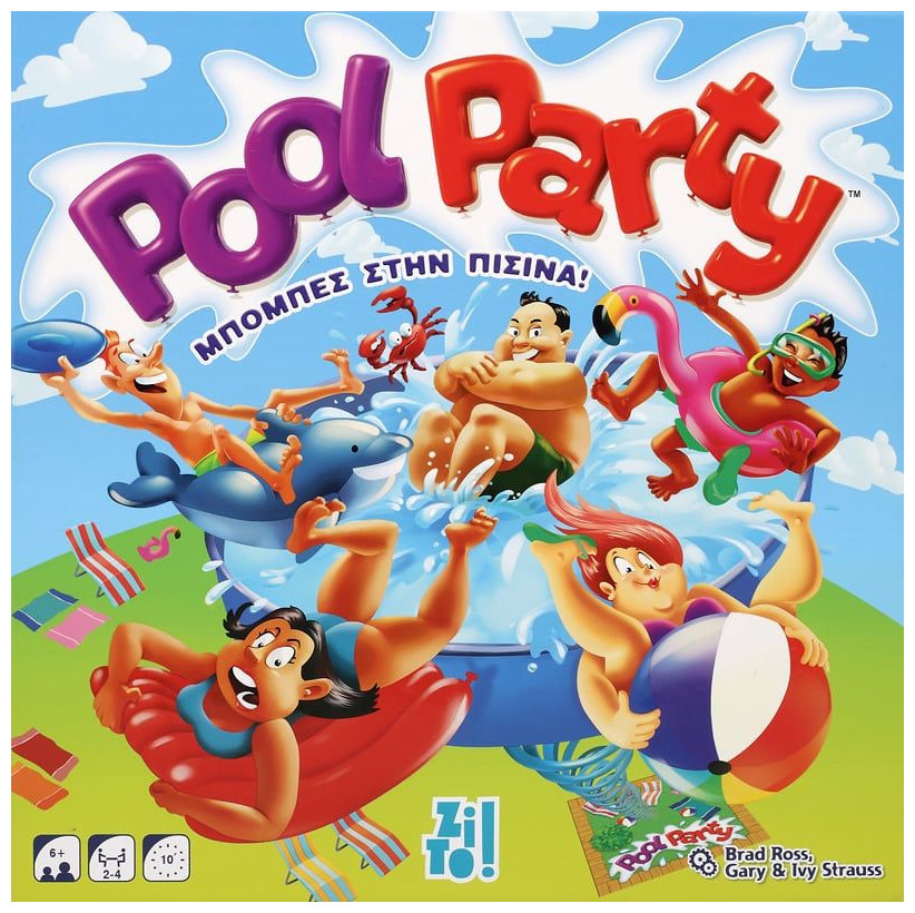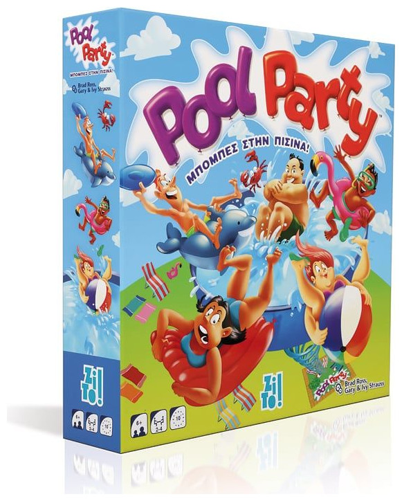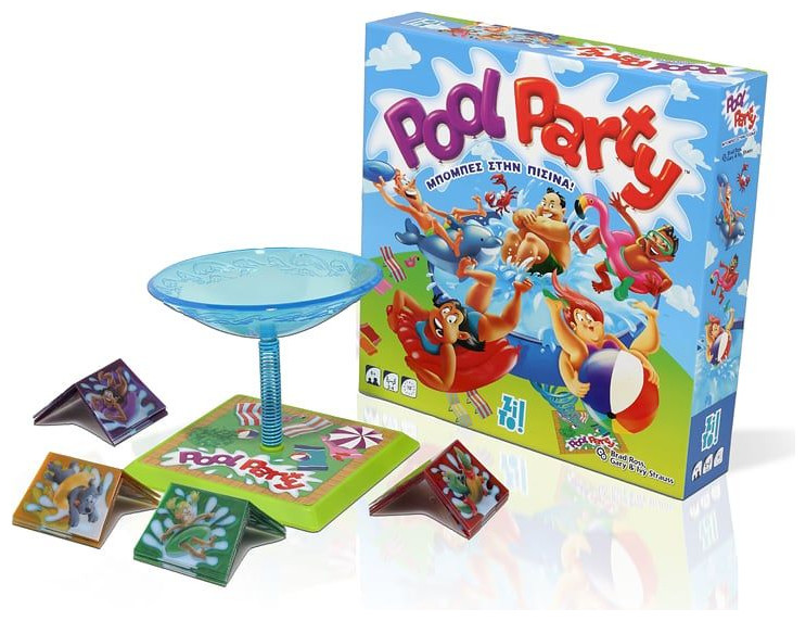 Βρισκόμαστε στην καρδιά του καλοκαιριού και ο ήλιος καίει! Κάνει πολλή πολλή ζέστη! Τι καλύτερο από ένα πάρτι στην πισίνα για να δροσιστείτε και να γιορτάσετε την εποχή της ξεγνοιασιάς; Αλλά γίνεται πάρτι στην πισίνα χωρίς διαγωνισμό με βουτιές; Όλοι ξέρουν τους κανόνες, δηλαδή ότι κερδίζει η βουτιά που θα δημιουργήσει τον μεγαλύτερο παφλασμό, όμως αυτή η μικρή πισίνα δε φτάνει για ένα τόσο μεγάλο πάρτι! Βεβαιωθείτε ότι οι κολυμβητές της ομάδας σας κάνουν τις καλύτερες βουτιές για να εντυπωσιάσουν τους κριτές, προτού η πισίνα ξεχειλίσει ή αναποδογυρίσει, γιατί τότε θα πρέπει όλοι να βγουν έξω!Το πιο ξεκαρδιστικό επιτραπέζιο παιχνίδι δράσης, ταχύτητας και ακρίβειας, για όλη την οικογένεια!Περιεχόμενα: 1 πισίνα (βάση, ελατήριο, μπολ), 36 κολυμβητές (4 ομάδες των 9 κολυμβητών), 1 βιβλίο κανόνων στα ελληνικά.