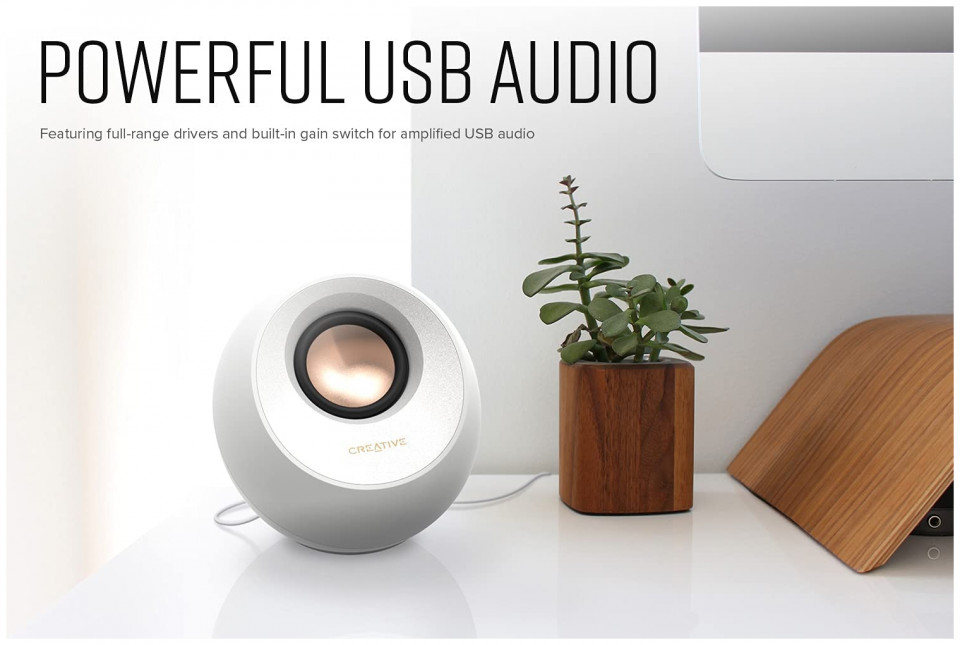 Το σύστημα ηχείων 2.0 της Creative έχει ισχύ 8 watt, περιλαμβάνει δυο στερεοφωνικά ηχεία που ταιριάζουν σε όσους θέλουν να τα τοποθετήσουν σε μικρό χώρο ή χρειάζονται ηχεία που μεταφέρονται εύκολα. Συνδέεται ασύρματα με συσκευές που διαθέτουν bluetooth όπως laptop και smartphone, είτε ενσύρματα με το κλασσικό βύσμα καρφί 3.5mm. Η τροφοδοσία τους πραγματοποιείται μέσω καλωδίου usb. Επιπλέον διαθέτει θύρα usb για να μπορείτε να ακούτε ήχο από το usb stick σας. Ισχύς: 8W Τύπος Σύνδεσης: USB-C, AUX/3.5mm, Bluetooth Τροφοδοσία: USB Διαθέτει τεχνολογία CLEAR DIALOG για καλύτερη επεξεργασία ήχου (audio processing) Amplified audio with High Gain Mode through built-in gain switch