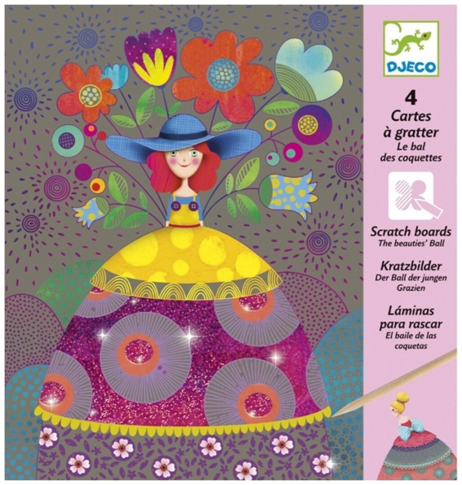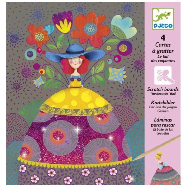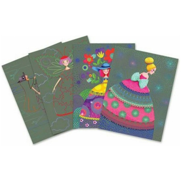 Καρτέλες ζωγραφικής από την εταιρεία Djeco τεχνοτροπίας ‘Scratch’. Χρησιμοποιήστε το ειδικό εργαλείο- ξυλάκι και αποκαλύψτε τις φιγούρες των κοριτσιών με τα πολύχρωμα φορέματα με μεταλλικές λεπτομέρειες. Η συσκευασία περιλαμβάνει τέσσερις καρτέλες με διαστάσεις 21×15 εκατοστά. Ηλικία: Από 6 μέχρι 10 ετών Διαστάσεις: Π220 x Y10 x Β230 χιλ.