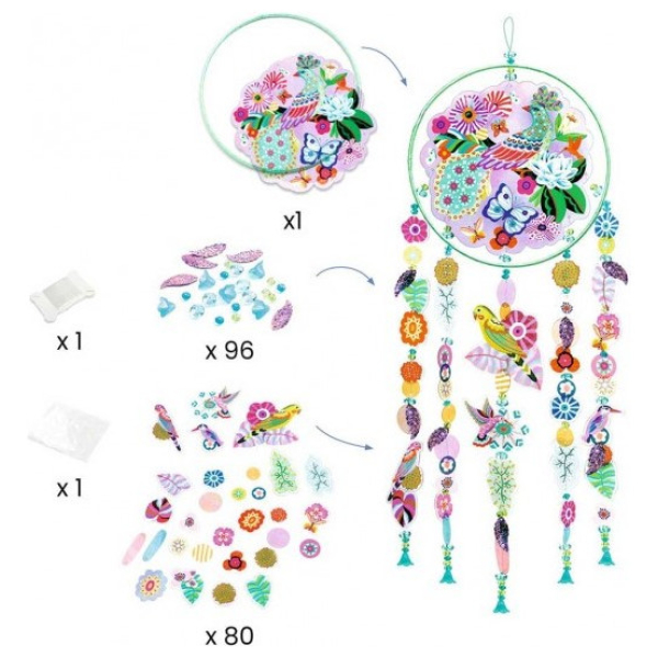 Κατασκευάστε ένα εντυπωσιακό μόμπιλε με παραδείσια πουλιά και διακοσμήστε το δωμάτιο σας! Τα παιδιά καλούνται να περάσουν χάντρες και ημιδιαφανή κομμάτια σε όμορφα σχέδια μέσα από την ειδική κλωστή, για να συνθέσουν ένα μόμπιλε που αντανακλά τις ηλιαχτίδες του ήλιου! Μια πρωτότυπη χειροτεχνία της σειράς Do It Yourself της εταιρίας Djeco, που εμπνέει τα παιδιά να αφήσουν τη φαντασία τους ελεύθερη και να κατασκευάσουν κάτι που θα το χρησιμοποιήσουν και για το οποίο θα είναι περήφανα, αποκτώντας περισσότερη αυτοπεποίθηση. Η δραστηριότητα αυτή αναπτύσσει τη συγκέντρωση, τη δημιουργικότητα, την λεπτή κινητικότητα και τον συντονισμό χεριού-ματιού των παιδιών. Το παιχνίδι περιλαμβάνει 96 χάντρες, 80 στοιχεία σε διαφορετικά σχέδια, 1 μεγάλο κρίκο, αυτοκόλλητα, πετονιά και εικονογραφημένες οδηγίες.