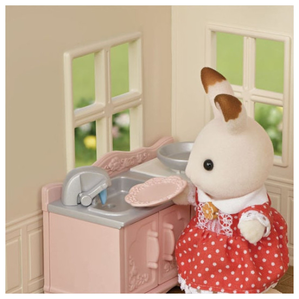 The Red Roof Cosy Cottage is perfect for anyone new to Sylvanian Families. This set contains a house, basic furniture and figure (Chocolate Rabbit girl), and can be played with on its own. The kitchen also comes with fun gimmicks! Bake apple pie, or pour water from the tap. Use the post box and parcel to send and receive post! Combine with the Furniture Starter Set or Bakery Shop Starter Set (sold separately) for even more fun imaginative playtime.*The Red Roof Cosy Cottage is perfect for anyone new to Sylvanian Families.*This set contains a house, basic furniture and figure (Chocolate Rabbit girl), and can be played with on its own.*The kitchen also comes with fun gimmicks! Bake apple pie, or pour water from the tap.*Stimulates imaginative role-playing for children.*Suitable for ages three years and above. Chocolate Rabbit girl, Red Roof Country Home, First Storey Floor, Ladder, Railing (L), Railing (S), Kitchen, Frying Pan, Omelette, Apple Pie, Fork, Plate, Dining Table, Chair x2, Bed (child size), Duvet, Parcel