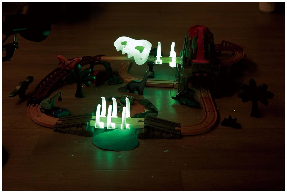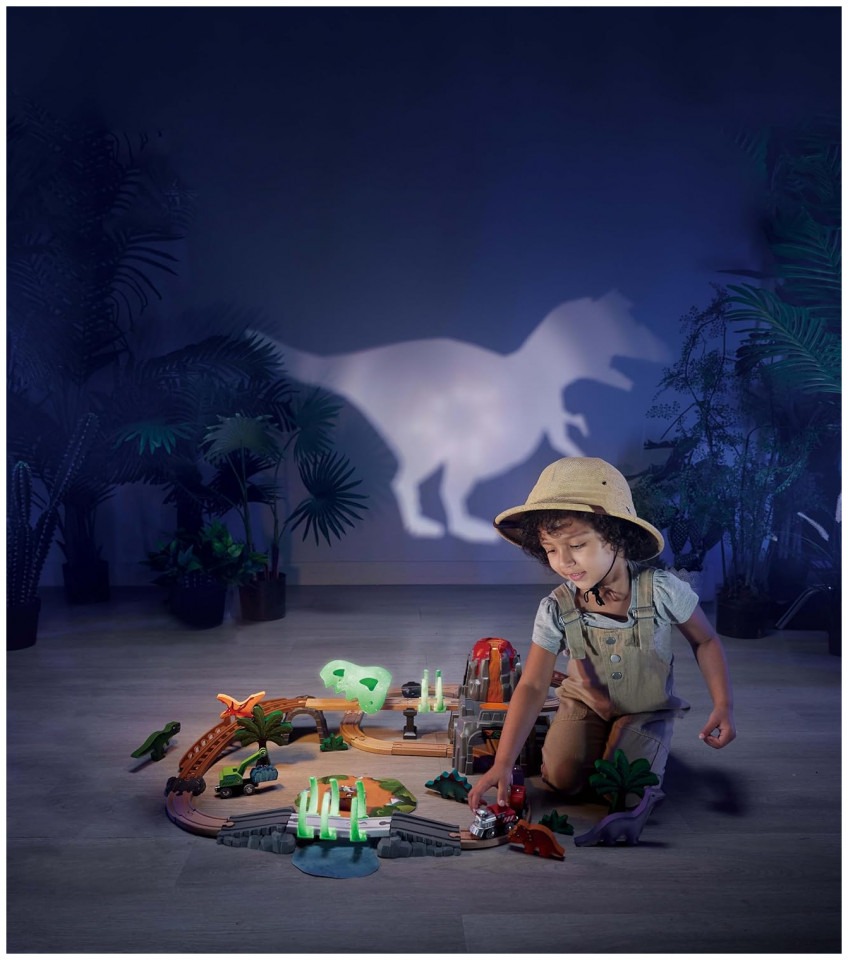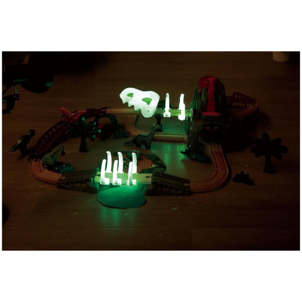 GLOWS IN THE DARK: The dinosaur skull and bones are made of special plastic material that can glow in dark. AN IMMERSIVE DINO WORLD: There are plenty of interactive elements to keep children engaged for example, the dinosaur skull and bones are made of special plastic material that can glow in the dark. Plus the dinosaur skull lifts, the crane transports cargo to the train, and when a train passes through the rib cage, you`ll hear exciting sound effects. OPEN-ENDED PLAY: This railway set is also compatible with other sets, encouraging children to use their creativity and imagination to build unlimited railway tracks. PLENTY OF PIECES: This railway set has 23 beech wood tracks and over 30 additional accessories including dinosaur figurines and gemstone blocks. AIDS DEVELOPMENT: Manipulating small train cars onto tracks and connecting them improves hand-eye coordination and fine motor skills.