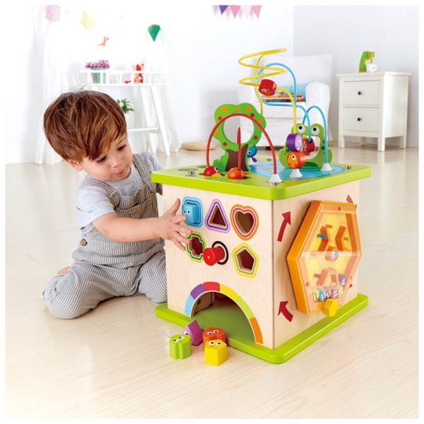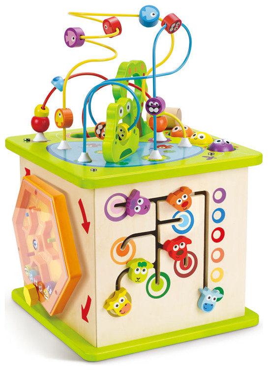 Mazes, shapes, levers, and lots of flying, swimming, and croaking creatures turn this colorful, five-sided activity center into a hub of activity. Made of sturdy wood with water-based paint, it’ll stand up to years of fun. www.youtube-nocookie.com/embed/vO7gKZtGsHQ