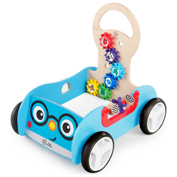 The Discovery Buggy wooden activity walker and wagon by Baby Einstein offers multiple modes of play. From sitting to standing, he can explore however he wants. With engaging activities on either side, baby and his friends can play with this toy at the same time. He’ll twist a gear to match shapes and drop blocks into the wagon. And little brother or sister can flip and spin the bold-patterned bead chaser. The wagon bed is wide open for baby to give his stuffed animal buddies a ride around the living room. Watch him discover how to link the six removable gears on the handle to make them all spin with every step! This wooden toy makes sure that no bump in the road will slow down baby’s big adventure. Adjust the wheel tension to safely control the wagon’s speed, so your little race car driver will only go as fast as you want.