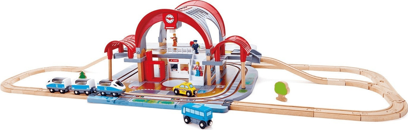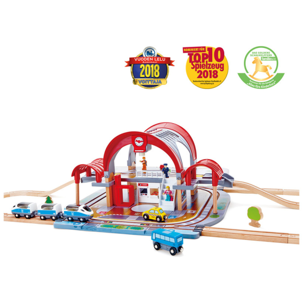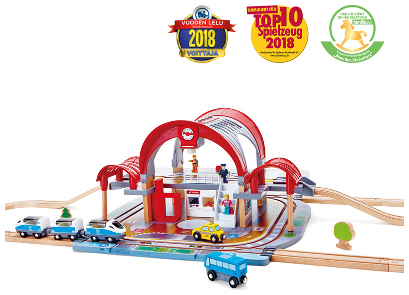 All aboard! This two-level station kit lets you experience all the thrills of a big city railway. Make your passenger buy a ticket, ride the lift and rush to catch the fast train. Includes recorder for station announcements, destination projector and light. Age: 3+ Years