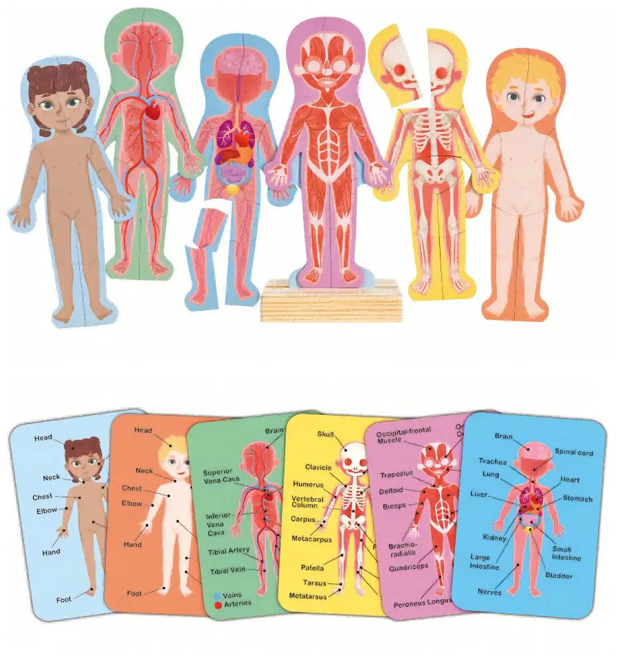 Suitable for 3Y and above Comprehensive 63-Piece Set: This educational set includes a wooden standing base, a body outline with boy and girl body magnets, a skeleton, a circulatory system, a muscular system, a nervous system with organs, and six double-sided human body cards. STEAM Development: Fostering development in science, technology, engineering, art, and math, this set promotes a range of skills including hand-eye coordination, fine motor skills, and problem-solving abilities. Educational Cards: The set includes six cards depicting various systems in the human body, aiding children in identifying and understanding these systems. Interactive Learning: Children can learn to identify different body parts and layers by matching them on a magnetic puzzle, providing a hands-on and engaging learning experience. Durable Construction: The wooden base of this puzzle is highly durable, and the strong magnetic backing can withstand hours of play, ensuring longevity and durability for extended educational use. Product Description Discover the marvels of the human anatomy with our magnetic assembly set. This amazing set lets you explore, learn and build the human body using interactive magnetic pieces. You can encourage imaginative play by pretending to be a doctor with your child. They can use the magnetic puzzle pieces to ‘diagnose’ and ‘treat’ their patient, making it a fun and educational experience. Item Weight: 1.1 lb, Product Dimensions (L x W x H): 9.45 x 3.54 x 7.09 inches