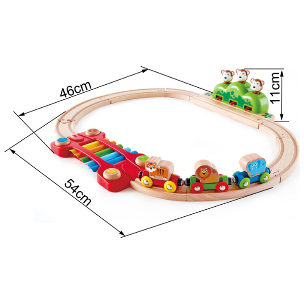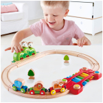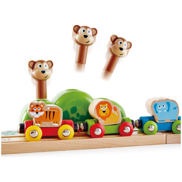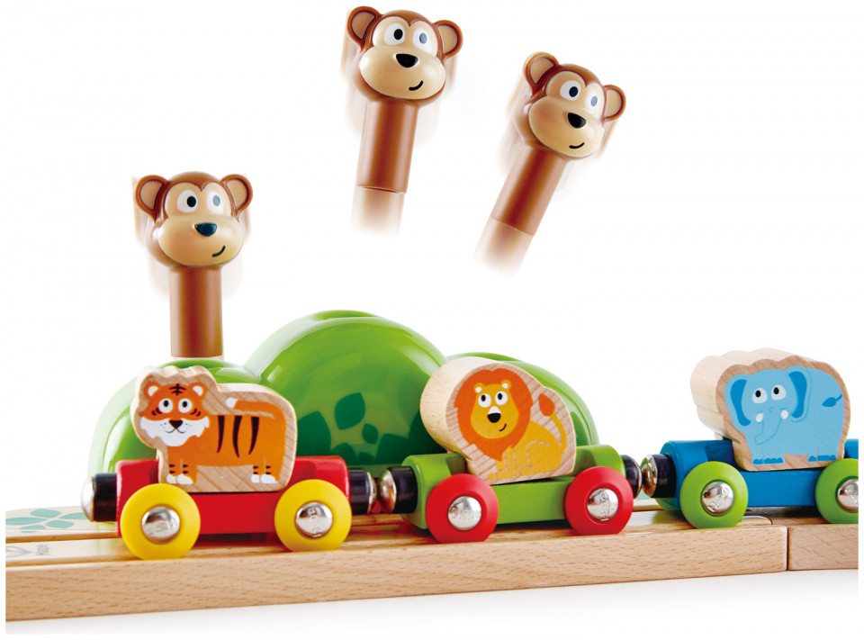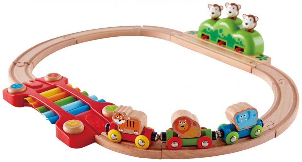This rail set offers delights at every turn! A beautiful melody plays as you drive the jungle train over the xylophone track. Then cheeky monkeys pop up as you pass the bushes! Age: 18+ Months