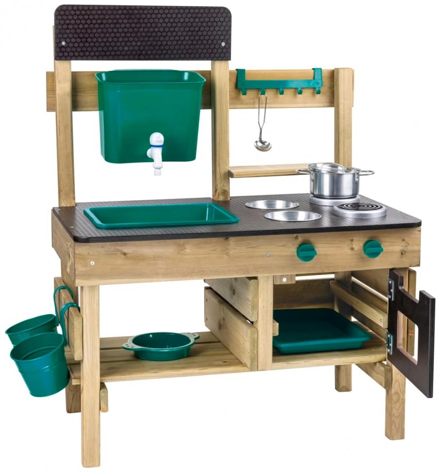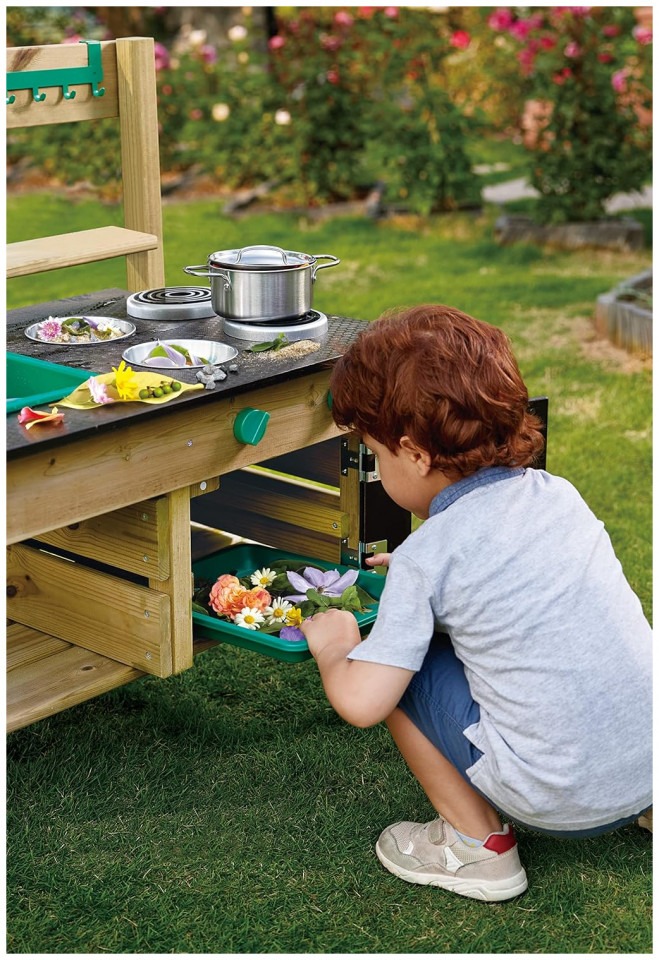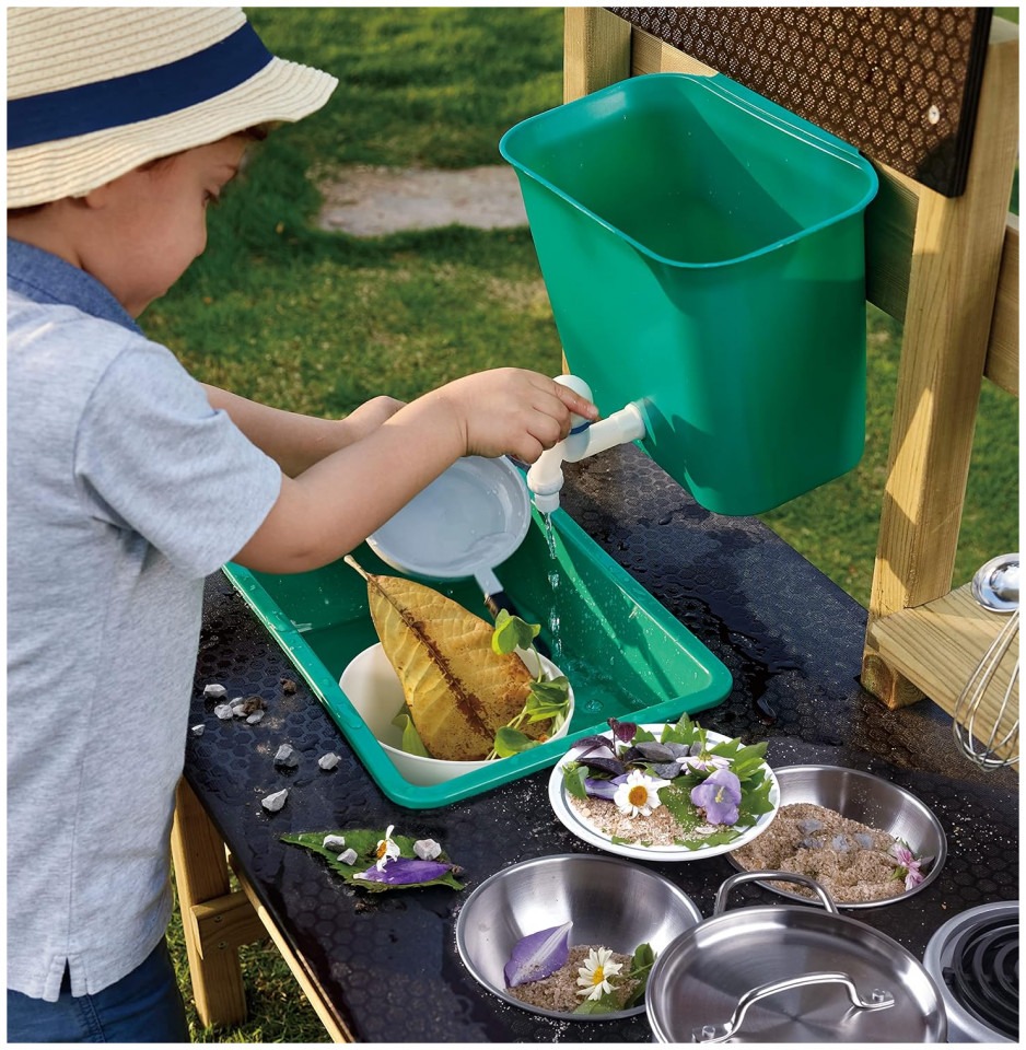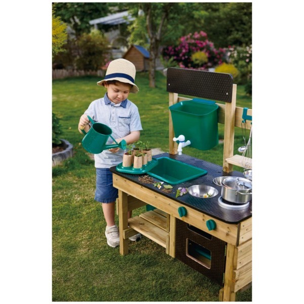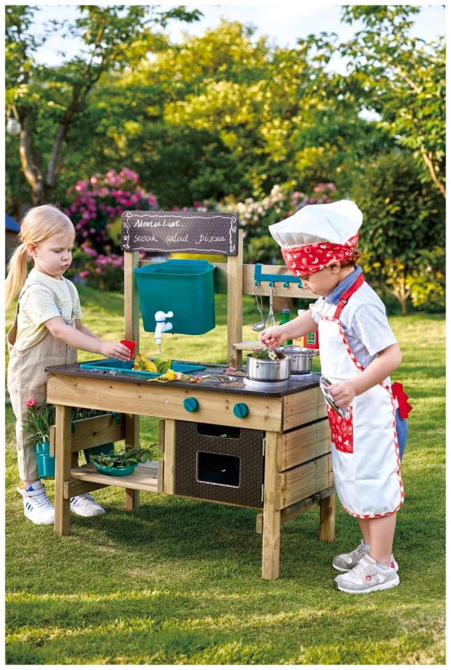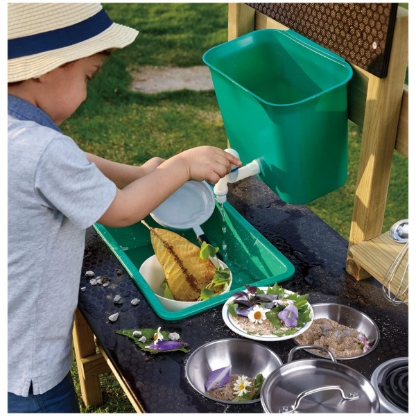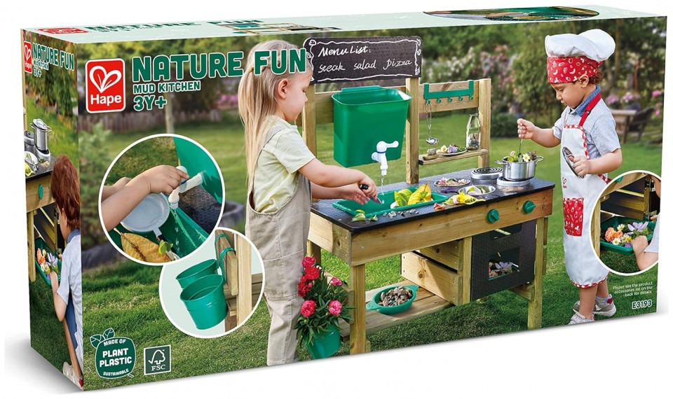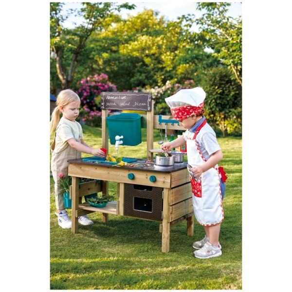 GREAT OUTDOOR KITCHEN PLAYSET: Preschoolers can’t wait to get their little hands on these cute accessories: a pot, ladle, two bowls, two flowerpots, a sieve, water tank, sink, faucet and oven plate. The perfect backyard toy for a busy kid GET OUTSIDE AND HAVE FUN: Enjoy the sunshine and fresh air with your little one while they put a menu on the blackboard, plant some flowers or veggies in the pots and pretend to cook food with leaves, rocks and mud DEVELOPS IMAGINATION AND SOCIAL SKILLS: By using their imagination to imitate grownup behavior, children develop social skills and sharpen their storytelling ability while staying active DURABLE AND LONG-LASTING: The anti-corrosive/ pressure treated, durable wood used for this outdoor playset means it will last for a long time – through the generations if there are other little ones waiting down the line FOR CHILDREN AGES 3+ YEARS: Hape toys are designed to encourage early childhood development, imaginative play, and interaction with caregivers and friends. Discover the next generation of play