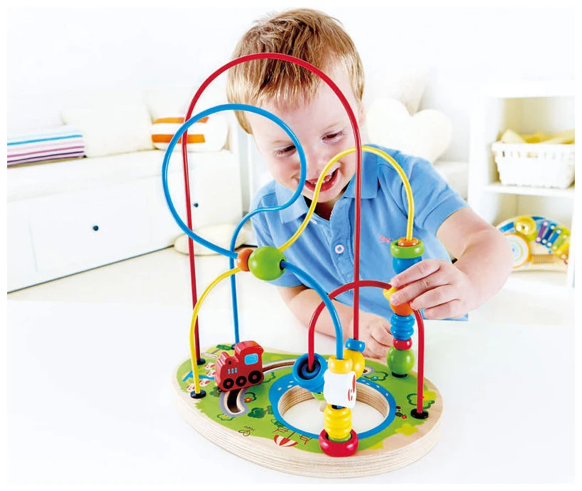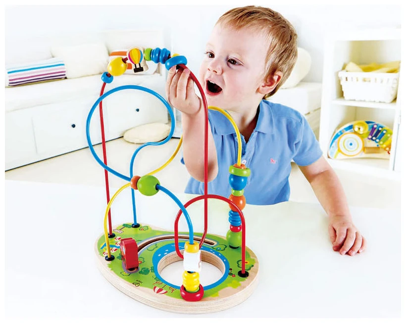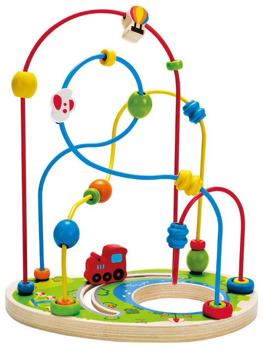 Over, under, around and through. Wooden beads, rings and winding paths create endless ways to play.