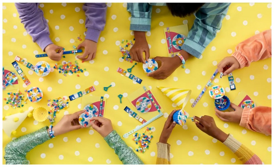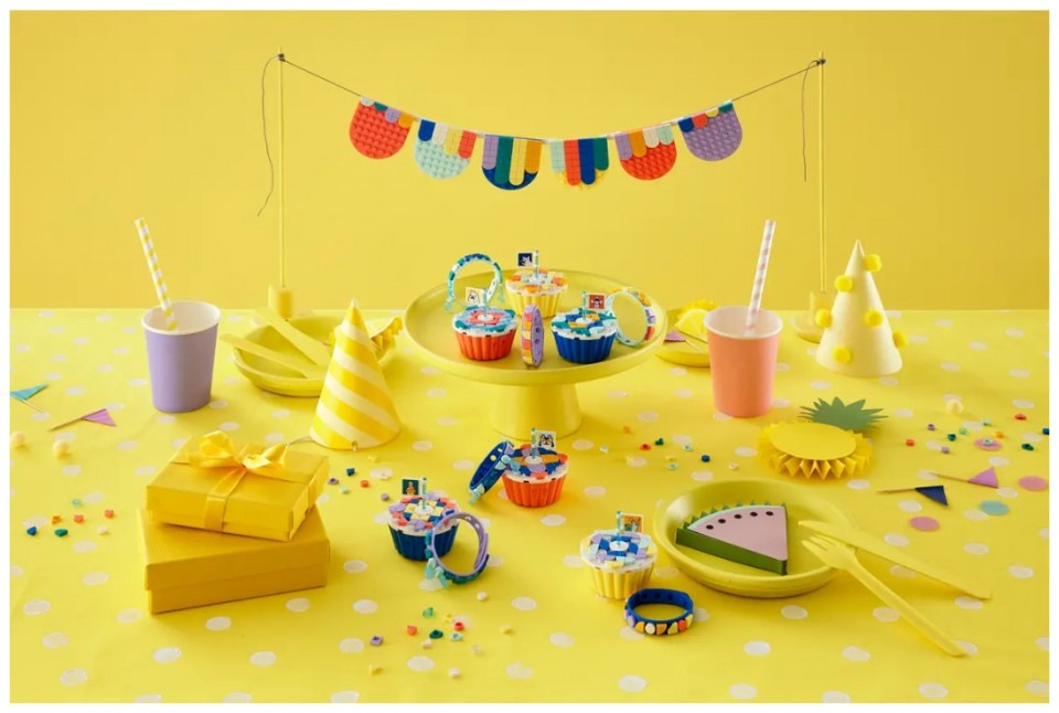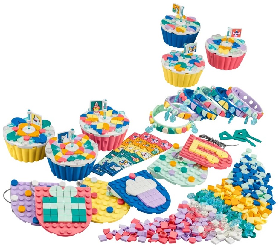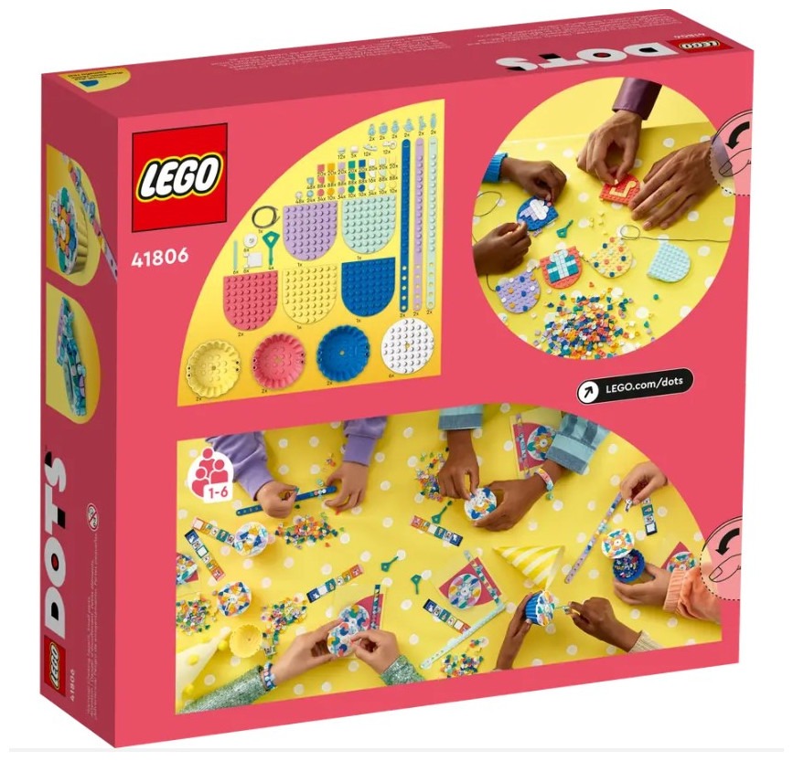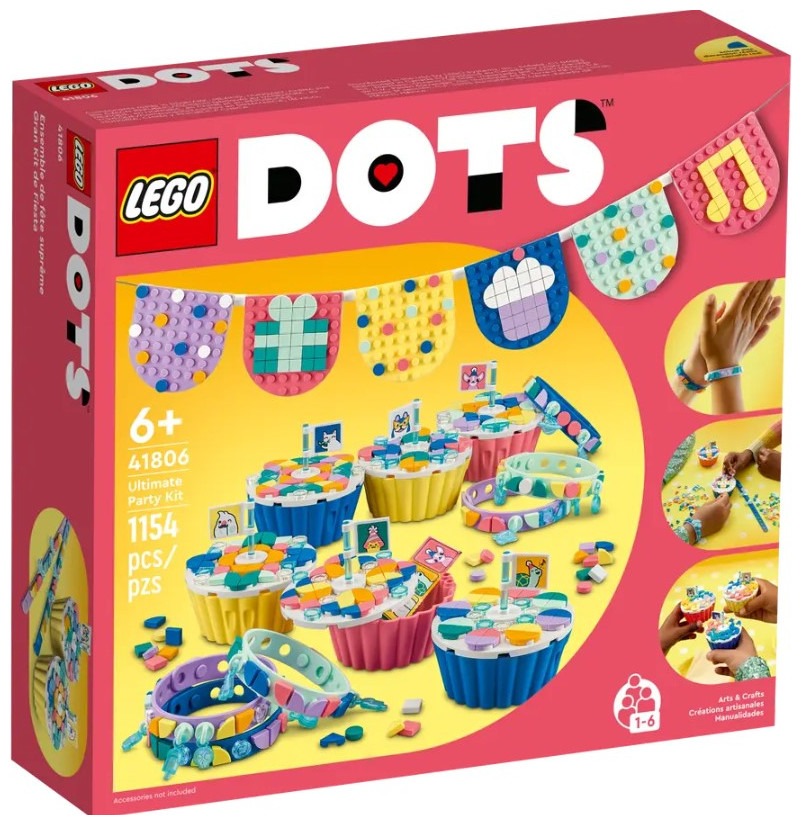 Hit the right note for creative fans aged 6 and up with this fun LEGO® DOTS Ultimate Party Kit (41806). Ready for quick assembly and decoration, this set offers the chance to create and experiment and makes keeping a group of kids entertained a snap for parents. The ultimate LEGO DOTS partyThis imaginative kit features 6 customizable cupcakes, with icing that can be removed to reveal a secret storage compartment inside, 6 bracelets, 6 bunting sections and the string to hang it up, plus plenty of tiles, flags, charms and stickers for kids to express themselves however they like. There’s also party inspiration to help parents make it the best day ever for their child. Fun for kids who love art and designDOTS sets introduce kids to the joy of LEGO play and experimentation as they make and decorate the different sets, because the magic and control lie in a child’s imagination. This kit makes a creative group activity with fun take-home gifts for any party or get-together. Creative decorating awaits – Surprise any crafts fan aged 6+ with this fun LEGO® DOTS Ultimate Party Kit (41806) set, featuring 6 cupcakes, 6 bracelets, 6 bunting pieces and loads more Start the party – Kids can help prep by decorating the bunting, then design the cupcakes and bracelets during the party. The kit includes shareable leaflets for the kids and a guide for parents What’s inside – Open-ended party fun awaits. The kit includes 6 bunting elements with string, 6 cupcakes, 6 bracelets, loads of tiles, charms, a shareable sticker sheet and lots of design inspiration Fun group activity – Any kid with a passion for art and design will love the creative possibilities. The cupcakes and bracelets make fun party favors that kids will love to take home Imaginative, portable fun – Each cupcake toy measures over 2 in. (6 cm) high and 2.5 in. (6 cm) wide and deep, and has a removable icing top and secret storage compartment inside Decorating starts fast – Easy-to-follow inspiration inside the packaging makes assembly a snap, with lots of space, tiles and other options for kids to make their favorite design or something new Design confidence – This LEGO® DOTS kit represents open creativity. The colorful cupcakes and bracelets offer bite-sized chances to build children’s ingenuity and imagination through fun Unlimited self-expression – LEGO® DOTS sets welcome kids to the joy of LEGO play through creating and customizing their own room decor and wearable items as many times as they like Uncompromising quality – Ever since 1958, LEGO® components have met stringent industry standards to ensure they connect consistently Safety first – LEGO® components are dropped, heated, crushed, twisted and analyzed to make sure they meet rigorous global safety standards