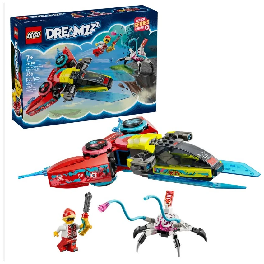 Encourage kids to unlock new levels of imagination with the LEGO® DREAMZzz™ Cooper’s Gaming Controller Jet (71489) building set for boys and girls. Inspired by the thrilling TV series, this fantasy playset lets fans build a transforming video game toy. Young dreamers have fun building the video game controller core model before choosing to transform it into a game speeder, which is a video game-inspired flying jet toy, or a game copter, which is a video-game inspired helicopter toy. Both options feature 2 stud shooters and an opening cockpit with enough room for a minifigure. The action is brought to life by Cooper, who comes with a weapon accessory, and a Cyber Brain Spider figure, which comes with 2 cables for draining Cooper’s vehicles. A great fantasy gift for kids, gamers and vehicle fans, the set includes story-led building instructions that let kids immerse themselves in imaginative play as they join Cooper on this thrilling adventure. Video game toy – Unlock new adventures with the LEGO® DREAMZzz™ Cooper’s Gaming Controller Jet building set for kids, which lets boys and girls create a transforming toy 1 set, 2 adventures – Build the video game controller core model before transforming it into a flying jet or a helicopter toy, both featuring 2 stud shooters and an opening cockpit LEGO® minifigure – The story is brought to life by LEGO DREAMZzz™ hero Cooper, who comes with a weapon accessory and can be seated inside the cockpit Spider toy – The set also includes a figure of the villainous Cyber Brain Spider, who comes with cable accessories that attach to the gaming controller model Expand the fun – The vehicle set includes modular boosters, which can be attached to other sets (sold separately) in the LEGO® DREAMZzz™ 2025 range Fantasy gift – The playset makes a gift for kids who love the LEGO® DREAMZzz™ TV series, as well as young gamers and vehicle-lovers Be part of the action – The set includes story-led building instructions that encourage kids to immerse themselves in the dream world adventure Dimensions – Includes 266 pieces and when built as the game speeder, the vehicle toy measures over 1.5 in. (4 cm) high, 9 in. (22 cm) long and 7 in. (18 cm) wide