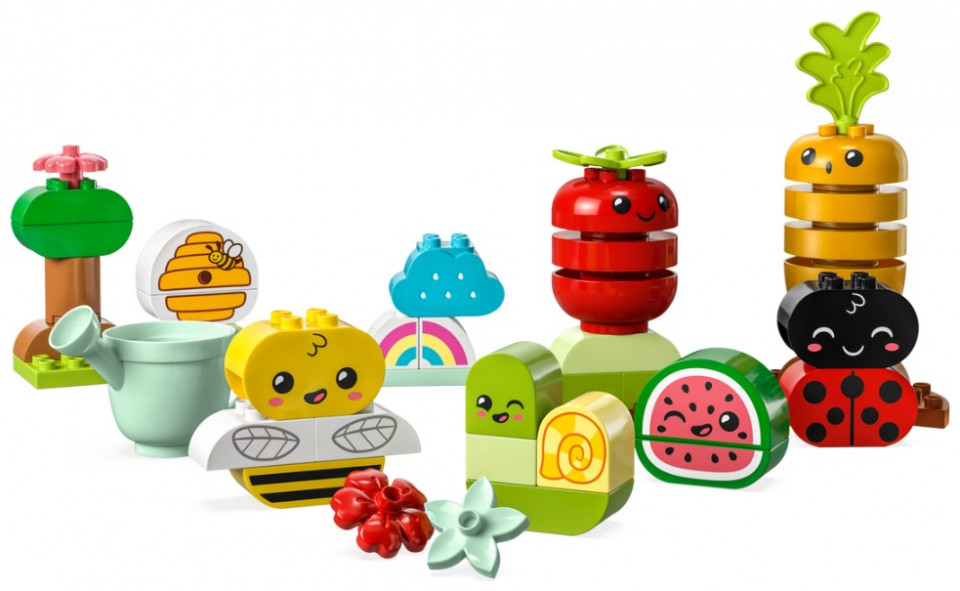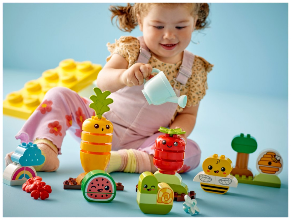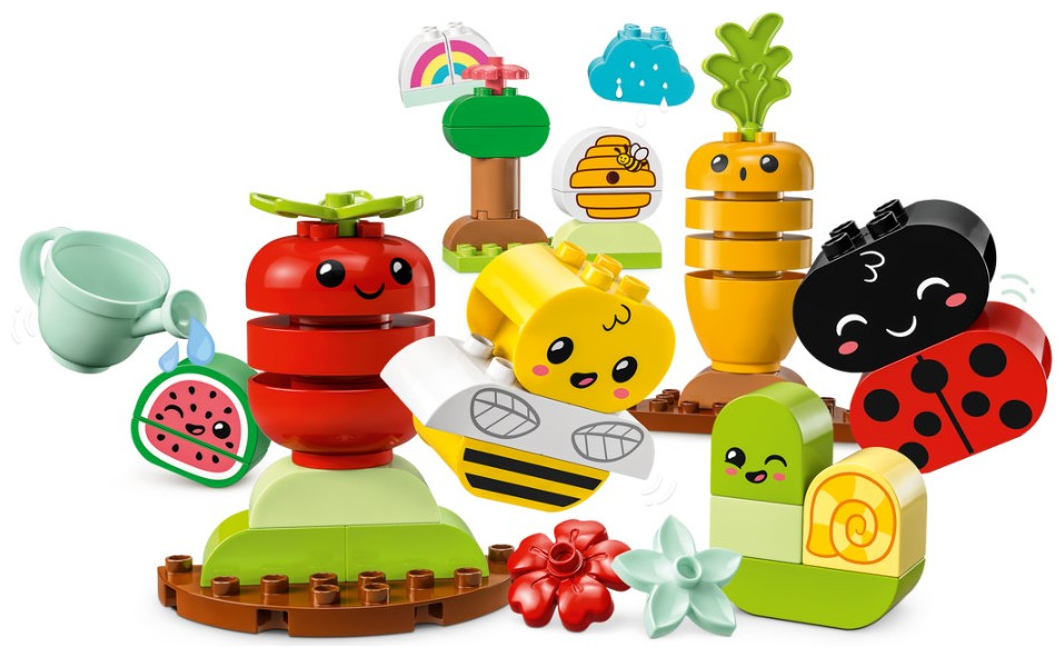 Immerse your little learner in nature with the LEGO® DUPLO® My First Organic Garden (10984) toy. This set is packed full of features to help parents spark conversations about what grows in the garden and introduces kids to the idea of an ecosystem. There’s plenty for little fingers to explore, including tomato, carrot and watermelon toys, trees, flowers, wildlife and weather bricks. When playtime is over, everything packs away neatly into the LEGO DUPLO brick box. Toys that develop kids’ learningLEGO DUPLO My First sets offer limitless opportunities for imaginative, playful learning. This hands-on set teaches toddlers how vegetables and fruits grow thanks to colorful stacking elements that help develop a toddler’s fine motor skills. The plants have cute faces to inspire kids’ self-expression and help them recognize diversity as they enjoy endless creative fun with this set of adorable food figures. Educational toys for toddlers – With the LEGO® DUPLO® My First Organic Garden (10984) toy, preschoolers aged 18 months and up learn about nature, creatures and how plants grow in the garden Feature-packed for imaginative play – Includes tomato, carrot and watermelon toys, rain-cloud and rainbow bricks, trees, flowers, a ladybug, bee, beehive and a watering can Play-and-learn creative fun – This versatile LEGO® DUPLO® set helps develop children’s self-expression and fine motor skills as they enjoy endless creative fun learning about the garden Gift for nature-loving kids – Looking for a learning toy for kids aged 18 months and up who love the garden? Give this creative toy for toddlers on birthdays, holidays or special occasions Teaching toddlers how to tidy – Stackable brick box measures over 7 in. (18 cm) high, 14 in. (36 cm) wide and 7 in. (18 cm) deep and keeps all the pieces together when playtime’s over Growing imaginations – Expand your little builder’s organic food fun with the Growing Carrot (10981), Fruit and Vegetable Tractor (10982) and Organic Market (10983) toys Step-by-step instructions – This set includes easy-to-follow picture instructions, with a digital version available on the LEGO® Builder app to get anyone new to LEGO building off to a great start A great start – LEGO® DUPLO® sets are expertly designed with engaging narratives, lots of colors, diverse characters and many details to give your little learner the best start in life Consistent quality – LEGO® DUPLO® toy playsets meet stringent industry standards to ensure they are easy for little fingers to pick up, place and pull apart: it’s been that way since 1969 Safety assured – The bricks and pieces in LEGO® DUPLO® kids’ learning toys are dropped, heated, crushed, twisted and analyzed to make sure that they meet demanding global safety standards