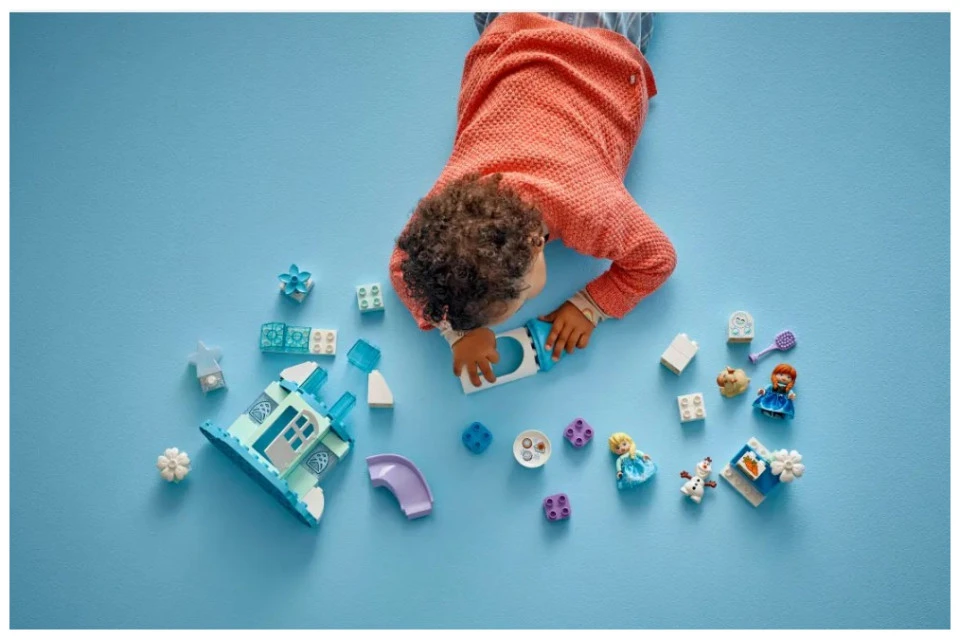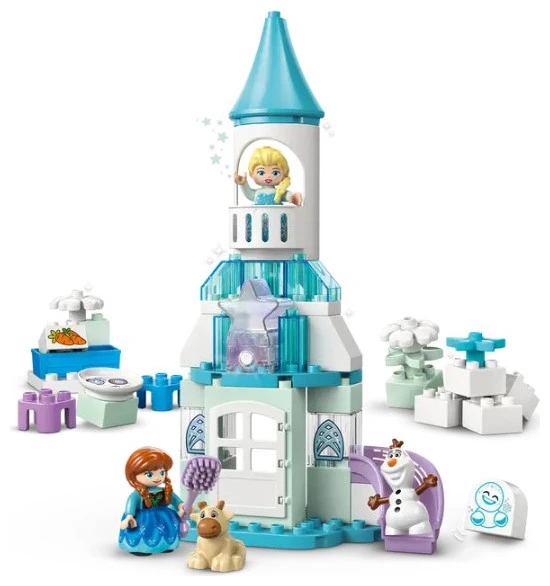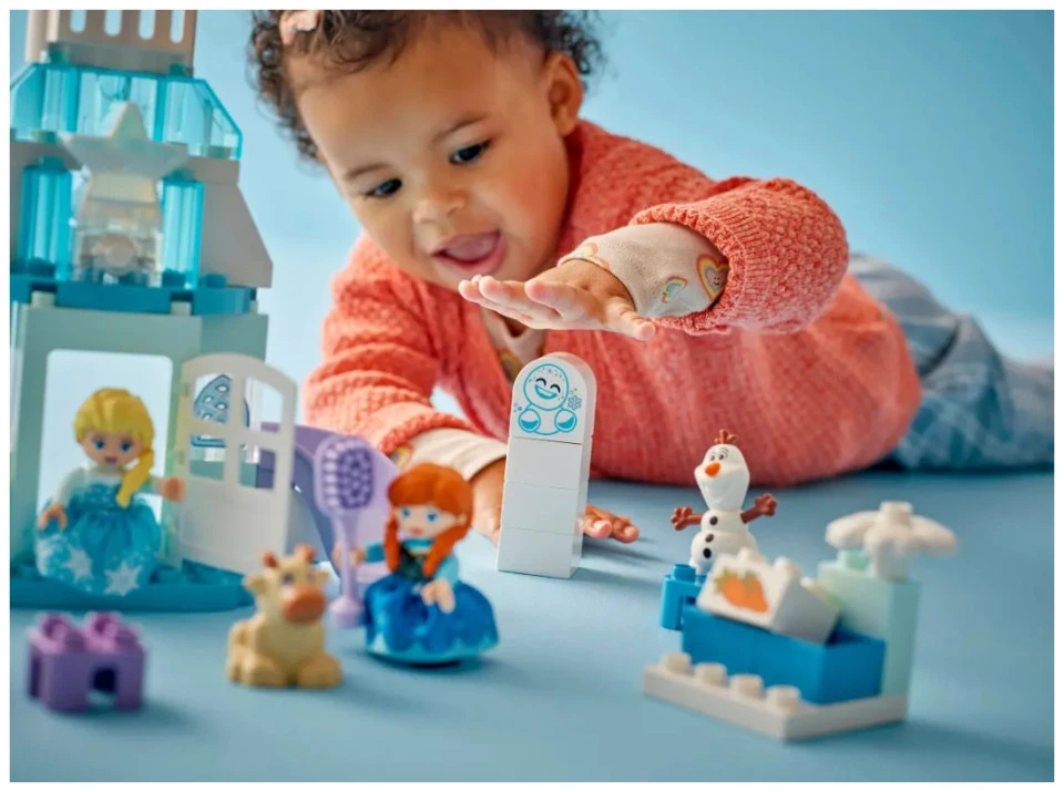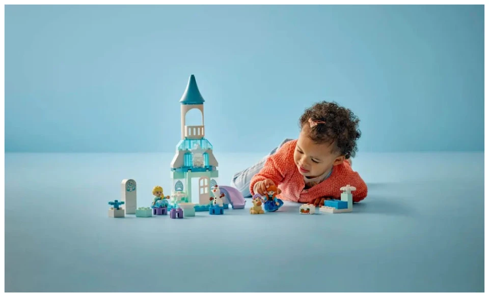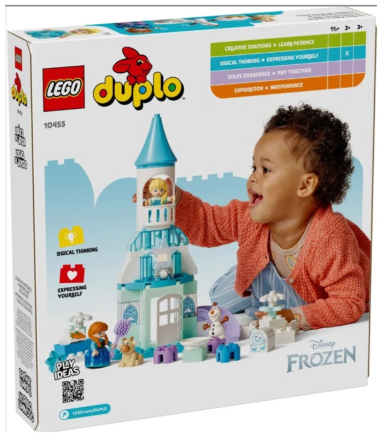 Immerse toddlers in a world of creative play with the LEGO® DUPLO® │ Disney Anna and Elsa’s Frozen Castle Party (10455) buildable toddler toy. It comes with LEGO DUPLO │ Disney characters Elsa, Anna, Marshmallow the Snowgie, Baby Sven and Olaf, giving preschoolers limitless pretend-play opportunities to imagine castle life and caring for baby Sven. Packed with learning moments, this buildable castle playset helps toddlers practise fine motor skills as they construct the palace. This buildable fantasy toy includes accessories to inspire nurture play. Toddlers and their families can use their imaginations to play out caring activities as they look after the baby reindeer. This learning construction toy for toddlers has lots of details to stimulate the senses. Elsa and Anna wear tactile fabric skirts, there’s a hinged door that little fingers can open to explore inside the Frozen castle and the set includes a multicoloured light brick to represent the northern lights. Contains 54 pieces. Pretend-play castle – Delight toddlers with this LEGO® DUPLO® │ Disney Anna and Elsa’s Frozen Castle Party buildable toy, which sparks imaginations as preschoolers play out Frozen fantasy stories Frozen features – The set comes with 5 LEGO® DUPLO® │ Disney characters Elsa, Anna, Marshmallow the Snowgie, Baby Sven and Olaf, plus accessories such as a slide, feeding trough and brush Buildable learning toy for toddlers – Preschoolers develop empathy, creativity and fine motor skills as they use this building toy’s many accessories to imagine caring for the baby reindeer Spark imaginative play – This buildable castle playset features a light brick (batteries included) to recreate the colorful glow of the northern lights Gift-giving for2-years-old and up – Give this hands-on buildable fantasy toy as an any-day treat to preschool Frozen fans who love creative play Digital building instructions – The LEGO® Builder app features a digital version of the building instructions included with this set, which has been rigorously tested for a safe play experience Learning toys for toddlers – LEGO® DUPLO® building toys are expertly designed to help little learners grow their passions and refine their preschool skills Dimensions – This 54-piece palace construction set measures over 14.5 in. (36 cm) high, 22 in. (56 cm) wide and 8.5 in. (21 cm) deep