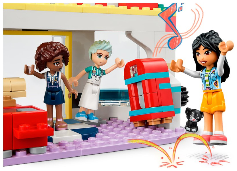 Kids aged 6 and up can role-play lots of restaurant stories with this LEGO® Friends Heartlake Downtown Diner (41728) building toy set. With lots of accessories to inspire creative play, they can pretend to make sandwiches or imagine being a customer at the diner. Features include a drive-through, outdoor seating, plus an arcade game and a moving jukebox. Kids can use the salad ingredients in the fridge to customize sandwiches. Other accessories include 2 drinks, money, 3 slices of bread for sandwiches, a napkin holder, a trash can and a skateboard. There’s also a mischievous cat who loves to visit the diner! Boost the building funGet ready for an easy and intuitive building adventure with the LEGO Builder app. Here kids can zoom in and rotate models in 3D, save sets and track progress. Welcome to the next generation of Heartlake CityKids make friends and discover exciting locations in the LEGO Friends universe, where they can enjoy creative play and act out real-life adventures. Restaurant role play for kids aged 6+ – Inspire hours of creative play with this LEGO® Friends Heartlake Downtown Diner (41728) set Includes 3 mini-dolls – This Heartlake City set comes with LEGO® Friends characters Liann, Aliya and Charli, plus lots of restaurant-inspired accessories Encourages imaginative role play – Kids can pretend to make sandwiches using the bread and the ingredients in the fridge or they can imagine being a customer at the diner A fun place to relax – Kids wholove to play restaurants will enjoy features like the drive-through, outdoor seating, plus an arcade game and a moving jukebox A toy to return to time after time – This LEGO® Friends gift for kids makes a fun birthday, holiday or any-other-day treat for kids aged 6 and up who love imaginative play Made for play – The diner measures over 11 cm (4.5 in.) high, 19 cm (7.5 in.) wide and 11 cm (4 in.) deep A helping hand – Discover intuitive building instructions in the LEGO® Builder app where you can zoom in and rotate models in 3D, track progress and save sets as your child develops new skills A new generation of Heartlake City – In January 2023, the LEGO® Friends universe expanded to introduce new characters and new locations to inspire more role-play adventures Uncompromising quality – All LEGO® components meet strict industry standards to ensure they are consistent, compatible and easy to build with A safe choice – LEGO® Friends bricks and pieces are dropped, heated,crushed, twisted and analyzed to make sure they meet stringent global safety standards