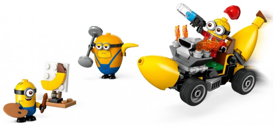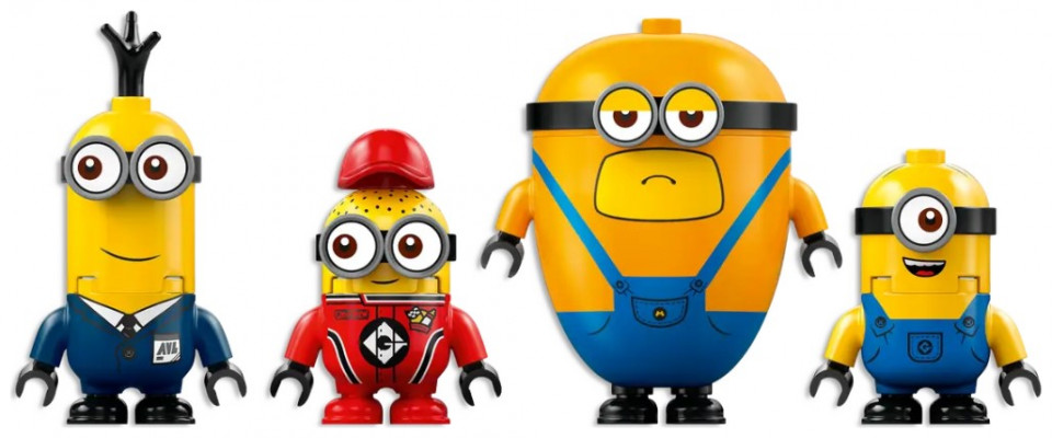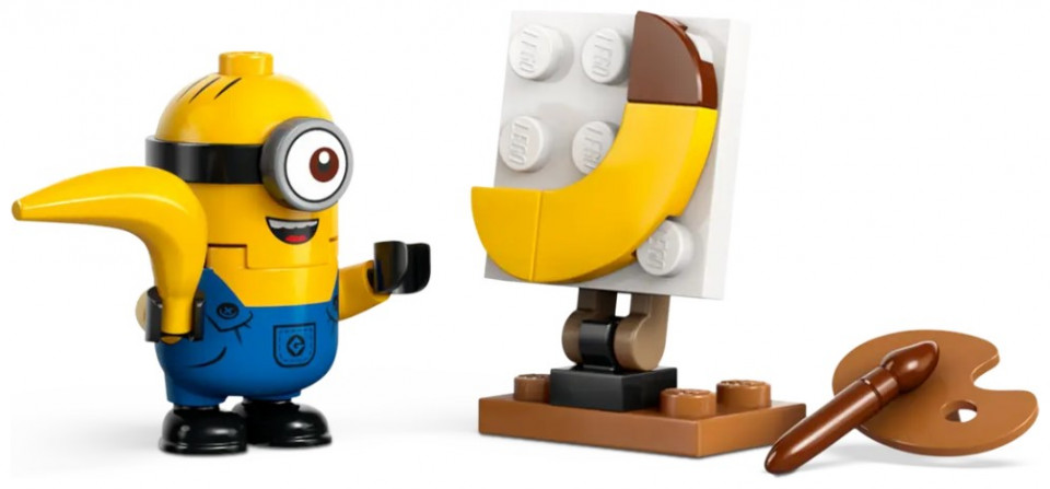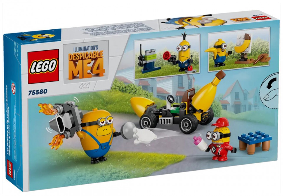 Treat a Minions fan to LEGO® Despicable Me 4 Minions and Banana Car (75580). This creative toy for kids features 4 Minions, a small car toy, plus accessories. It’s a fun movie-toy gift for boys and girls aged 6+ and fans of Illumination’s Despicable Me 4. Looking for a Minion LEGO set, small toy car or a fun gift? Check out the Minions’ banana car, with its driver’s seat and removable engine. The vehicle toy comes with 4 Minions and accessories. Mega Minion Dave can lift the engine in one handand a weight-lifting bar in the other. Mel paints a picture of a banana, while Secret Agent AVL Minion Tim flies by with spinning rotor blades on his head and a remote control in his hand. On the ground is his workstation, filled with special tools, including X-ray goggles. Pit Crew Minion Ron is on diaper duty at the changing table. He has all the gear, including a dirty-diaper-disposal gun. Builders can also have digital fun as they zoom in and rotate sets using the LEGO Builder app. Minion toys for kids – Treat boys and girls who are fans of Illumination’s Despicable Me 4 movie to this Minions and Banana Car fun toy for kids aged 6 and up Minion’s movie toys – Includes a banana vehicle toy for kids with a removable engine, Minions Mel, Pit Crew Ron, secret agent AVL Tim and Mega Minion Dave, plus lots of accessories Creative building Minion playset – With a small kids’ toy car, 4 different Minion figures and a whole bunch of tools and gadgets, this Minion gift ideais bursting with play possibilities Fun accessories – Dave’s weight-lifting bar, Secret Agent AVL Tim’s wearable X-ray glasses and helicopter headwear, Pit Crew Ron’s dirty-diaper-disposal gun, a banana and a LEGO® painting of a banana Minion gift ideas – This fun movie toy for kids makes a gift for any Minion fan and children who have watched any of the Illumination’s Despicable Me movies 3D building instructions – Kids can download the LEGO® Builder app for an immersive building experience, with digital tools to zoom in and rotate models in 3D, save sets and track progress More Minions movie toys – There are additional LEGO® Despicable Me 4 playsets available (sold separately) for kids who want to collect, combine and customize the Minions fun Portable Minion toys – This 136-piece set’s banana car measures over 2.5 in. (6 cm) high, 5 in. (13 cm) long and 1.5 in. (4 cm) wide