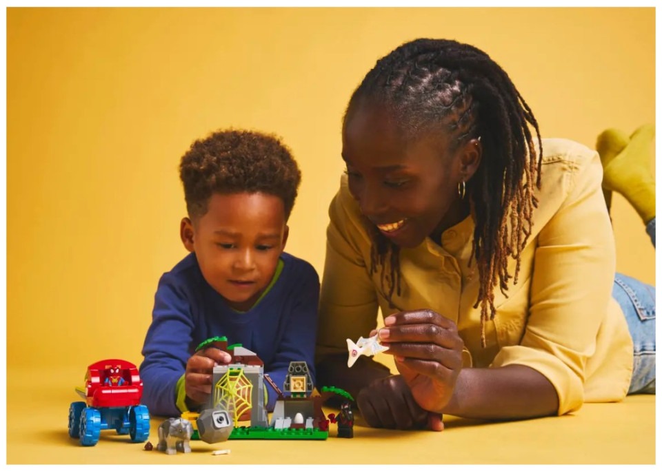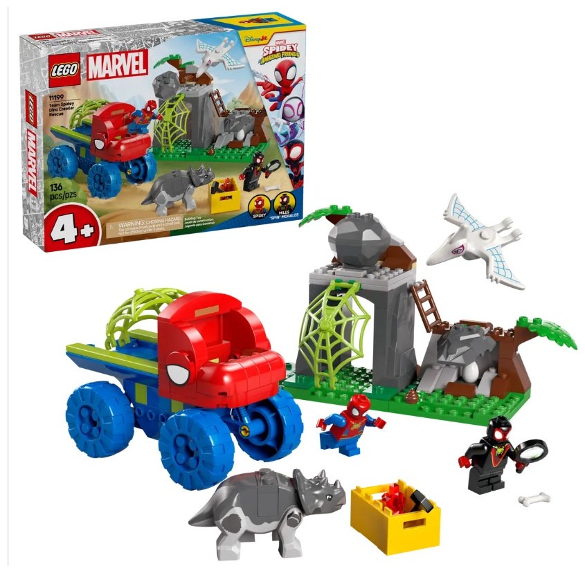 Treat fans of Spidey And His Amazing Friends to Team Spidey Dino Crawler Rescue (11199), a build-and-play dinosaur set created for kids aged 4 and up. This buildable dino-truck toy features Super Heroes, dinosaurs and fun accessories to inspire imaginative role play for boys and girls that boosts their confidence and problem-solving skills. This buildable LEGO® playset includes Spidey and Miles “Spin” Morales minifigures and 2 buildable dinosaur figures: Ghost-Spider as a pterodactyl and Rhino as a triceratops. There’s Spidey’s LEGO Dino Crawler truck with a large web attached to the rear, a trigger-operated rock-fall feature, a dinosaur egg to reveal, and a web that can be lowered to trap the villain. Intuitive instructions are provided in the form of a colorful picture-story guide and separate bags contain bricks and a large Starter Brick to make construction quick and easy. LEGO sets for ages 4 and up are the perfect way for adults to share building fun with youngsters. Buildable Super Hero dinosaur toys for kids – Team Spidey Dino Crawler Rescue for boys and girls aged 4 and up who love Super Heroes, dinosaurs and the Spidey And His Amazing Friends TV show Minifigures, dinos and a truck – There’s 1 quick-to-build model per bag, plus a guide and large Starter Brick, so play can get started quickly Dinosaur adventures with buildable figures – Kids join Spidey, Miles “Spin” Morales, Ghostosaurus and Dino-Rhino along with Spidey’s Dino Crawler truck with a large web attached to its rear Build-and-play adventure toys – Creative kids can enjoy an interactive experience with a hidden dino egg, LEGO® Spidey webs to trap villains, and a trigger-operated rockfall Treat for kids – This buildable Super Hero and dinosaur toy makes a great gift for boys and girls aged 4 and up who are fans of the Disney+ TV show Spidey And His Amazing Friends Expand the fun – Check out the extensive range of compatible LEGO® vehicle toys and buildable LEGO Marvel playsets (sold separately) for kids aged 4 and up Buildable preschool toys for imaginative play – LEGO® sets for kids aged 4 and up introduce children to a universe of movie favorites, TV characters and everyday heroes 136-piece set – The Dino Crawler vehicle measures over 3 in. (8 cm) high, 4 in. (10 cm) long and 2 in. (6 cm) wide
