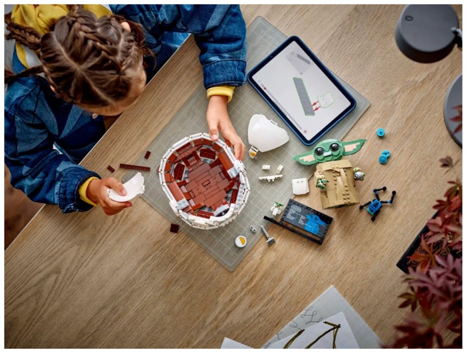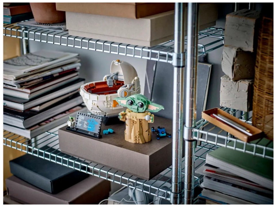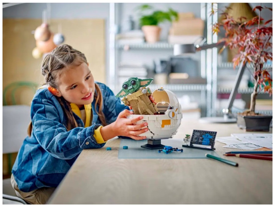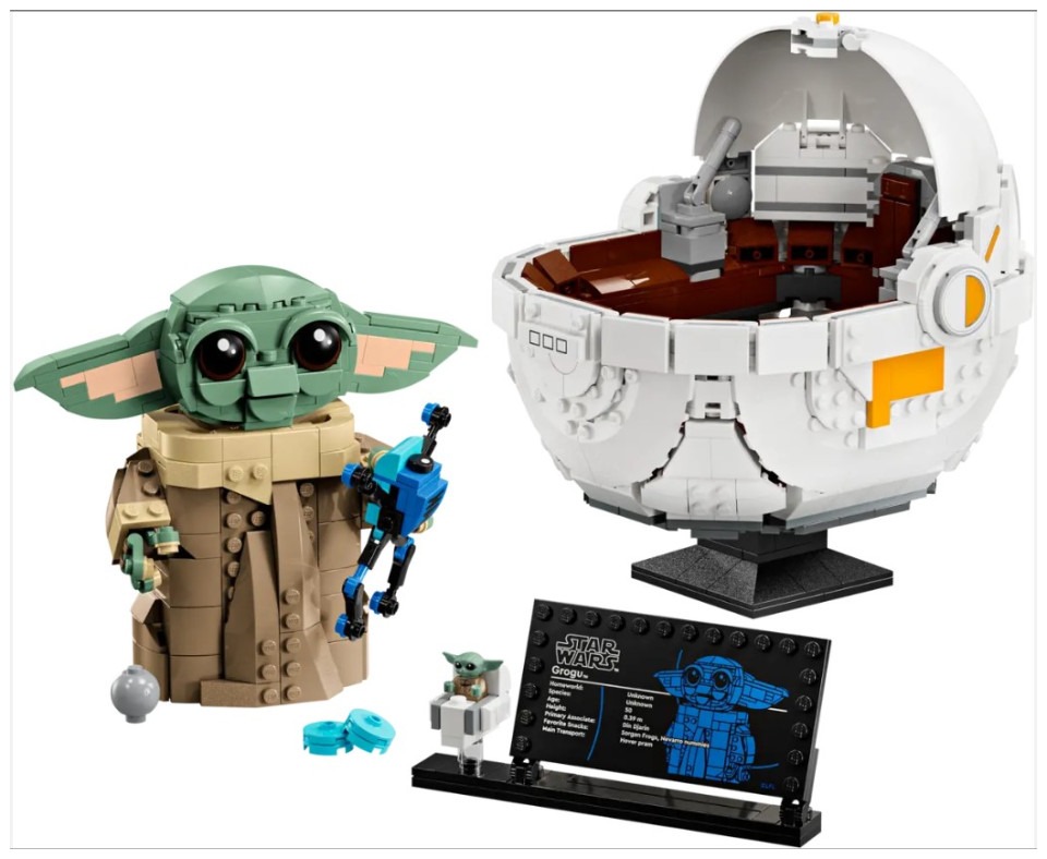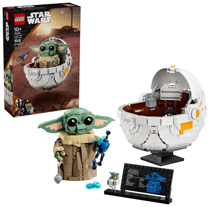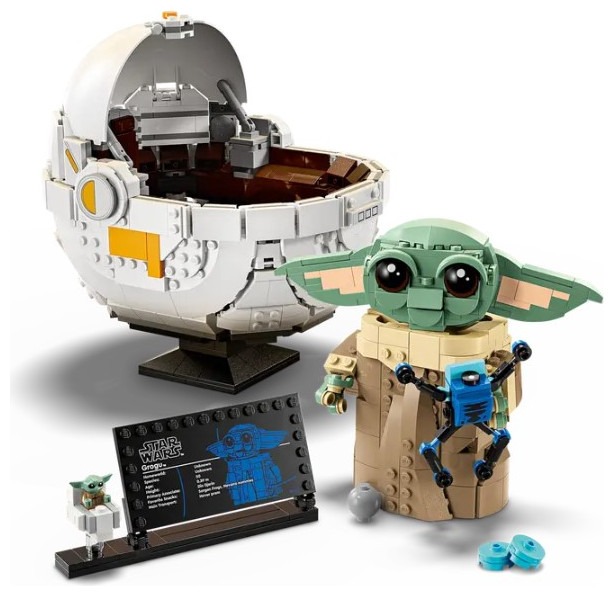 Let kids build their love of Grogu with this LEGO® Star Wars™ buildable Grogu toy figure with hover pram (75403). A cute gift for boys, girls and any Star Wars: The Mandalorian™ fans aged 10 plus, this build-and-display model makes fun and playfulroom decor. Grogu has dial-operated arms and posable head and ears, and he can be displayed in or out of the hover pram. There are also a brick-built Sorgan frog (Grogu’s favorite snack!), a shifter knob and a cookie for Grogu to hold. The main model i n this Star Wars collectible toy building set is complemented by a standard-size Grogu LEGO figure in a small buildable hover pram, plus an information plaque to complete a joyful display. The set comes with step-by-step instructions and check out the LEGO Builder app for intuitive, 3D zoom and rotate viewing tools to enhance the creative experience. LEGO® Star Wars™ buildable Grogu toy figure and hover pram – Create a cute Star Wars: The Mandalorian™ display featuring Grogu Build-and-display model with playful details – The Grogu buildable figure has dial-operated arms and a posable head and ears, and it can be displayed in or out of the hover pram Authentic accessories – This fantasy set includes a LEGO® brick built Sorgan frog, a shifter knob and a cookie for Grogu to hold in his hands Grogu LEGO® figure – The main buildable toy model comes with a Grogu information plaque on a stand with space for the included standard-size Grogu LEGO figure in a small buildable hover pram Gift for boys, girls and fans – Give this1,048-piece building kit to kids aged 10 plus and any Star Wars: The Mandalorian™ fans and collectors Intuitive instructions – The LEGO® Builder app guides your youngster on an intuitive building adventure with tools that let them zoom in and rotate a 3D digital version of their model as they build LEGO® Star Wars™ sets for all ages – LEGO Star Wars collectible toy building sets (sold separately) let kids and adult fans recreate classic scenes, make up new stories or display the buildable models Dimensions – Grogu in his brick-built hover pram toy measures over 7.5 in. (19 cm) high, 7 in. (18 cm) long and 6 in. (16 cm) wide