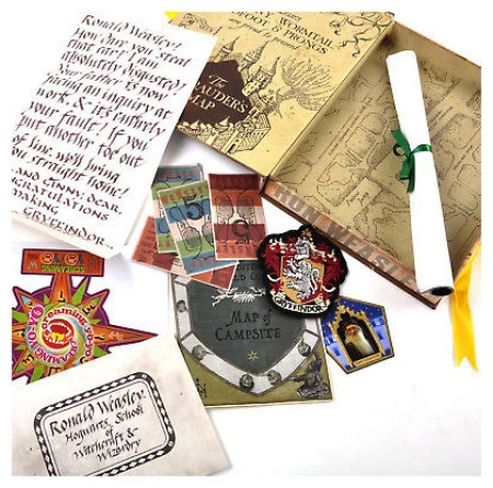 Set includes Gryffindor Uniform Stitched Crest, Quidditch World Cup Map, Howler Letter, Dumbledore Card, Chudley Cannons Poster, Weasley Betting Slip and Weasley Twins Product Package. Box measures approx 20 x 28 cm
