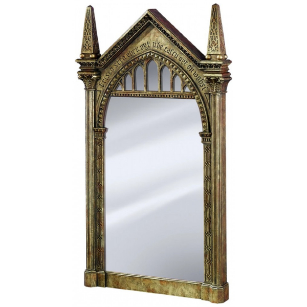 A recreation of the Mirror of Erised as seen in the movie Harry Potter and the Sorcerer´s Stone . Mirror measures 45 cm in height and 21 cm in width. It can be mounted on a wall or can rest on a tabletop.