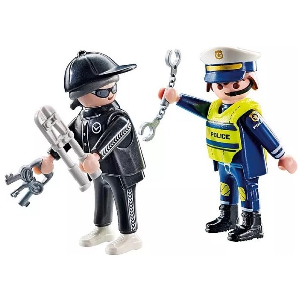 Ο αστυνομικός, με το όπλο και τις χειροπέδες, πιάνει τον ληστή στην τελευταία στιγμή! Τώρα η πόλη μπορεί να είναι ξανά ασφαλής! Η καταδίωξη ξεκινά! Ο αστυνομικός βρίσκεται στα ίχνη του πονηρού διαρρήκτη, ο οποίος έχει μαζί του έναν κόφτη και ένα σετ κλειδιών. Εξοπλισμένος με το αλεξίσφαιρο γιλέκο, το καπέλο και τα ακουστικά του, ο αστυνομικός είναι έτοιμος για δράση, φροντίζοντας να αποδοθεί δικαιοσύνη. Αυτό το συναρπαστικό PLAYMOBIL σετ είναι γεμάτο με συναρπαστικές λεπτομέρειες για ατελείωτο δημιουργικό παιχνίδι. Με ρεαλιστικά αξεσουάρ, όπως τα όπλα και τις χειροπέδες του αστυνομικού, τα παιδιά μπορούν να δημιουργήσουν τις δικές τους αστυνομικές περιπέτειες. Ιδανικό για μικρούς ντετέκτιβ και λάτρεις της αστυνομικής δράσης, αυτό το σετ εγγυάται ώρες διασκέδασης, θεαματικές καταδιώξεις και τολμηρές συλλήψεις! δύο φιγούρες PLAYMOBIL, σωσίβιο γιλέκο, καπέλο αστυνομικού, ακουστικό, χειροπέδες, καπέλο, κλειδιά, κόφτης Ηλικία: Από 4 ετών και άνω
