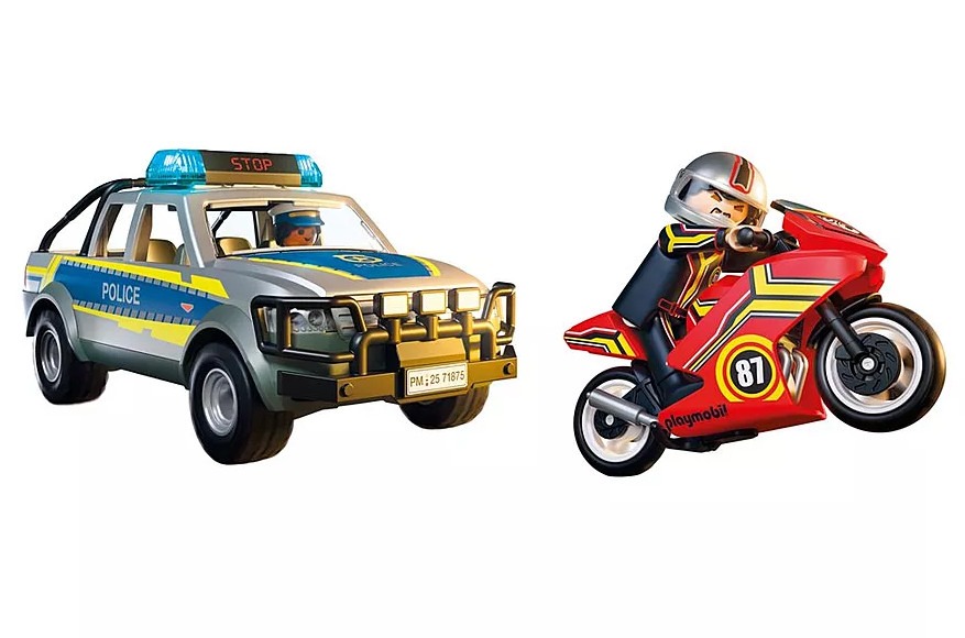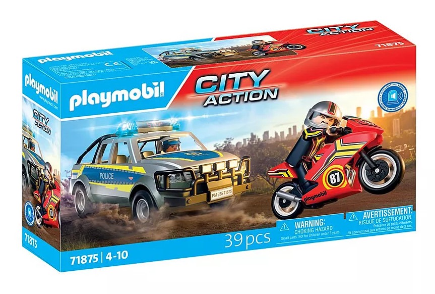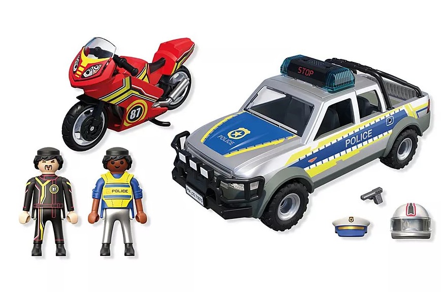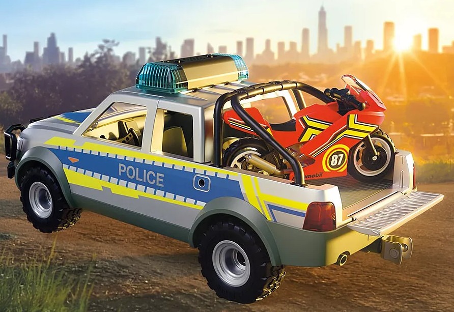 Θα καταφέρει ο κακοποιός να ξεφύγει με την κόκκινη μοτοσικλέτα του; Έχει σκεφτεί μια διαδρομή απόδρασης μέσα από λοφώδεις επαρχιακούς δρόμους κοντά στο δάσος. Ευτυχώς που η αστυνομικός είναι σήμερα στον δρόμο με το καινούργιο περιπολικό φορτηγάκι. Με τον μπλε φάρο και τη δυνατή σειρήνα έχει αναλάβει την καταδίωξη. Μπορείς να τη βοηθήσεις να πιάσει τον μοτοσικλετιστή που τρέχει; Μαζί θα τα καταφέρετε! Τη μοτοσικλέτα μπορείτε να τη μεταφέρετε στο αστυνομικό τμήμα στην καρότσα από το φορτηγάκι. Μπείτε στη δράση με το Αστυνομικό όχημα Pickup και μοτοσυκλέτα! Ο εγκληματίας διαφεύγει με την κόκκινη μοτοσικλέτα του, αλλά η αστυνομικίνα είναι πίσω του με φάρους που αναβοσβήνουν και σειρήνα. Το ανθεκτικό Pick-Up χωρά τέσσερις φιγούρες και μπορεί να μεταφέρει τη μοτοσικλέτα με αναδιπλούμενη βάση πίσω. Μια τέλεια περιπέτεια για μικρούς μαχητές του εγκλήματος που αγαπούν τη δράση πάνω σε τροχούς!