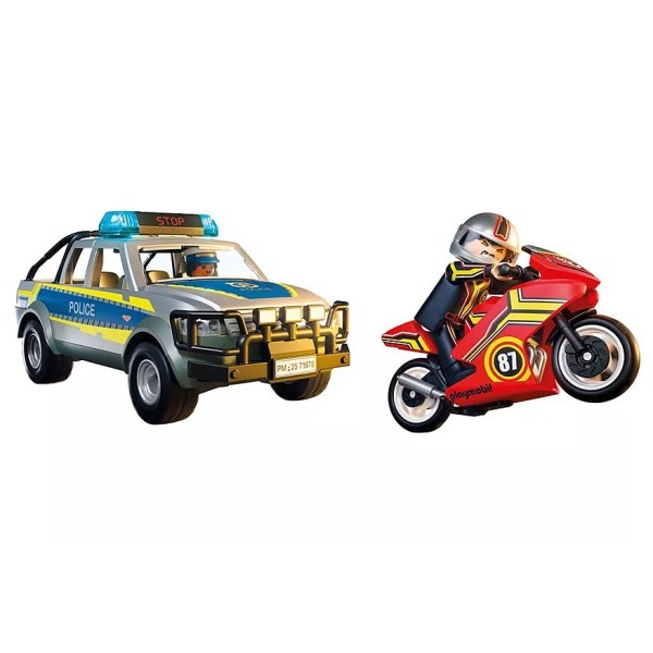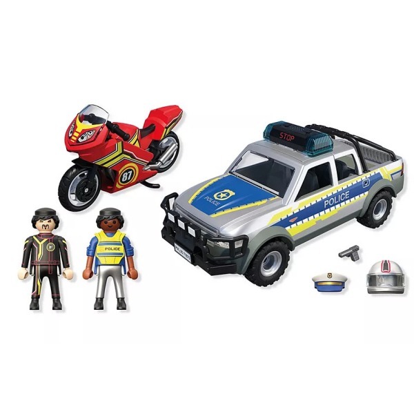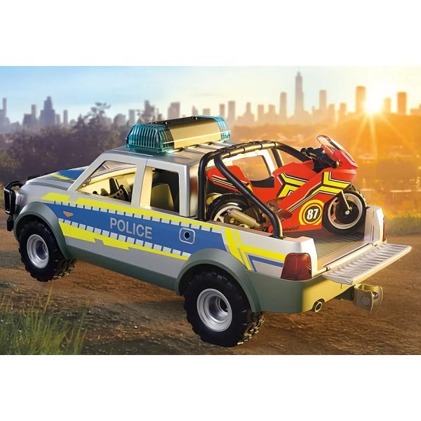 Θα καταφέρει ο κακοποιός να ξεφύγει με την κόκκινη μοτοσικλέτα του; Έχει σκεφτεί μια διαδρομή απόδρασης μέσα από λοφώδεις επαρχιακούς δρόμους κοντά στο δάσος. Ευτυχώς που η αστυνομικός είναι σήμερα στον δρόμο με το καινούργιο περιπολικό φορτηγάκι. Με τον μπλε φάρο και τη δυνατή σειρήνα έχει αναλάβει την καταδίωξη. Μπορείς να τη βοηθήσεις να πιάσει τον μοτοσικλετιστή που τρέχει; Μαζί θα τα καταφέρετε! Τη μοτοσικλέτα μπορείτε να τη μεταφέρετε στο αστυνομικό τμήμα στην καρότσα από το φορτηγάκι. Μπείτε στη δράση με το Αστυνομικό όχημα Pickup και μοτοσυκλέτα! Ο εγκληματίας διαφεύγει με την κόκκινη μοτοσικλέτα του, αλλά η αστυνομικίνα είναι πίσω του με φάρους που αναβοσβήνουν και σειρήνα. Το ανθεκτικό Pick-Up χωρά τέσσερις φιγούρες και μπορεί να μεταφέρει τη μοτοσικλέτα με αναδιπλούμενη βάση πίσω. Μια τέλεια περιπέτεια για μικρούς μαχητές του εγκλήματος που αγαπούν τη δράση πάνω σε τροχούς!
