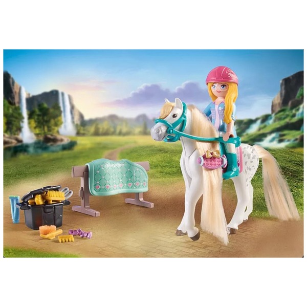 Στην Isabella αρέσει πολύ η ομορφιά και η μόδα. Στο κομμωτήριο αλόγων βγάζει πολλές φωτογραφίες τα όμορφα μαλλιά του Lioness, μετά την προπόνηση. Ο Lioness ανυπομονεί κάθε φορά να δει τι χτένισμα θα κάνει η Isabella στην χαίτη του. Βέβαια, μόλις η χαίτη είναι έτοιμη, θα βγούν μαζί φωτογραφία! Fun Fact: Ο πατέρας της Isabella είναι ο δημιουργός της φημισμένης Σπιτικής Λεμονάδας του Waterfall, και εκτός από εκείνον, η Isabella είναι η μόνη που ξέρει τη μυστική συνταγή. Στο Μεγάλο Ράντσο, στους πρόποδες των Λευκών Όρεων, οι πέντε φίλοι, η Amelia, η Isabella, η Zoe, η Ellie και ο Ben περνάνε τον ελεύθερο χρόνο τους, παρέα με τα αγαπημένα τους άλογα. Η blogger Isabella, προσπαθεί να δημιουργήσει μια μεγάλη διαδικτυακή κοινότητα, που χάρη στην αγάπη της στην ομορφιά και την μόδα, έχει αποκτήσει ήδη πολλούς ακόλουθους που παρακολουθούν τις περιπέτειές της με τον Lioness κάθε μέρα. Χαρακτηριστικά προϊόντος: • Το σετ περιλαμβάνει την Isabella, το άλογο Lioness, χτένα μαλλιών και πολλά αξεσουάρ. • Η χαίτη και η ουρά του αλόγου μπορούν να χτενιστούν. • Η σείρα παιχνιδιών PLAYMOBIL Horses of Waterfall είναι κατασκευασμένη από 80% βιώσιμα υλικά. Ηλικία: Από 5 ετών και άνω