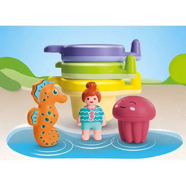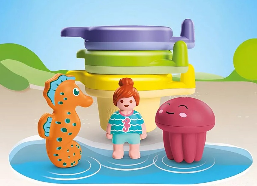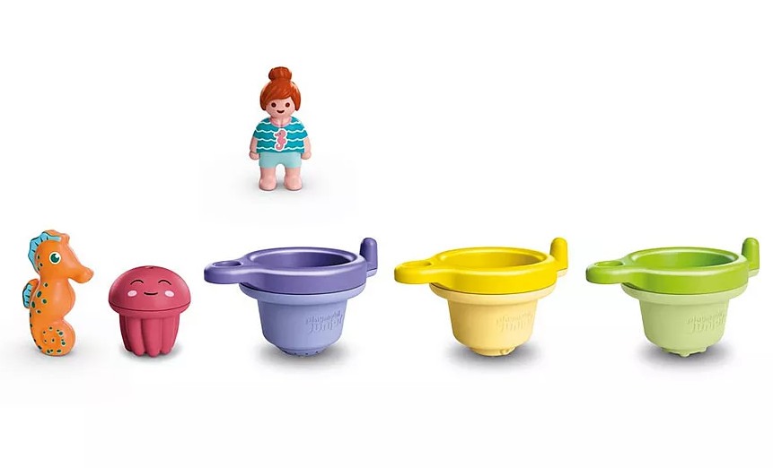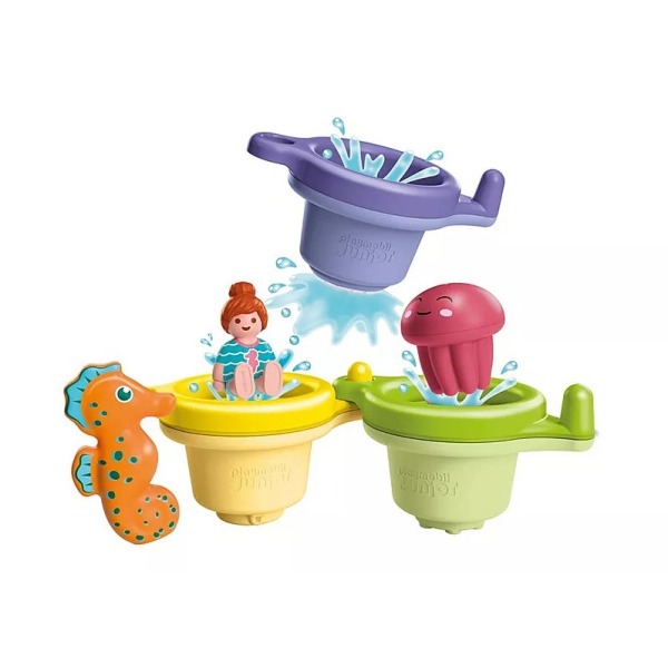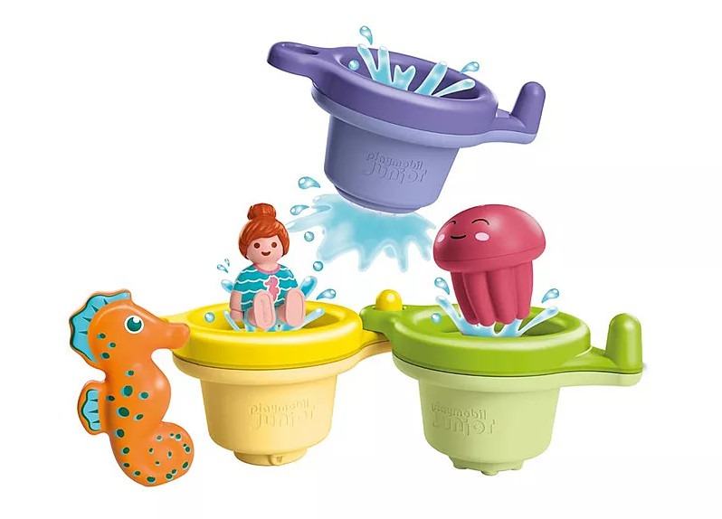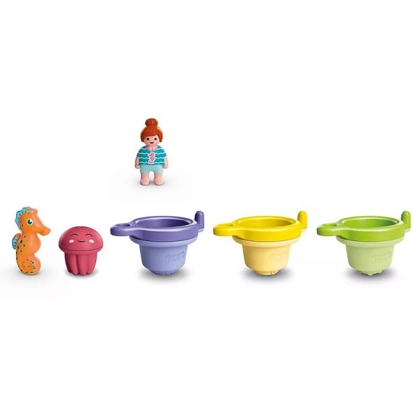 Τουτ τουτ! Τι κολυμπάει στην μπανιέρα; Ένα χαρούμενο σκάφος με δραστήρια ζωάκια της θάλασσας σε προσκαλεί για ανακαλύψεις και πειράματα. Τα τρία πλωτά κύπελλα φροντίζουν για άφθονη διασκέδαση στην μπανιέρα. Ποιο κύπελλο βρίσκει το παιδί σου πιο συναρπαστικό; Τα πλωτά κύπελλα μπορούν να ενωθούν πολύ εύκολα σε ένα χαρούμενο τρένο. Ο γλυκούλης ιππόκαμπος και η μικρή μέδουσα έχουν εξαντληθεί από το πολύ κολύμπι και πιάνουν γρήγορα θέση στα κύπελλα. Ποιος έχει ανακαλύψει ήδη τις λειτουργίες που έχουν τα κύπελλα; Απλά σήκωσε το γεμάτο κύπελλο στον αέρα και παρατήρησε με ποιον τρόπο βγαίνει ξανά έξω το νερό. Με τόση διασκέδαση στο νερό, ο χρόνος στο μπάνιο περνάει χωρίς να το καταλάβεις. Στο τέλος στοιβάζεις γρήγορα τα κύπελλα το ένα μέσα στο άλλο και είναι τακτοποιημένα.