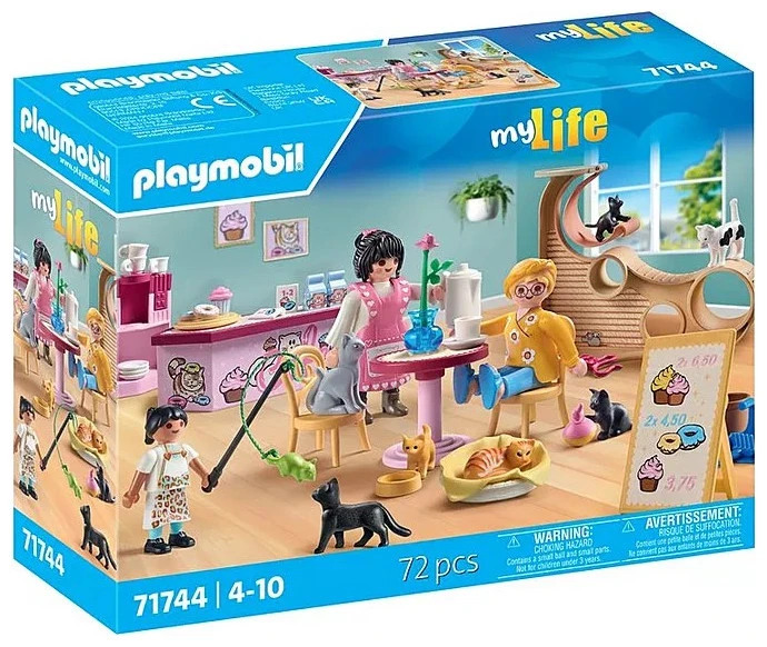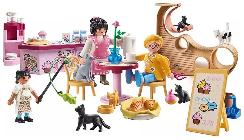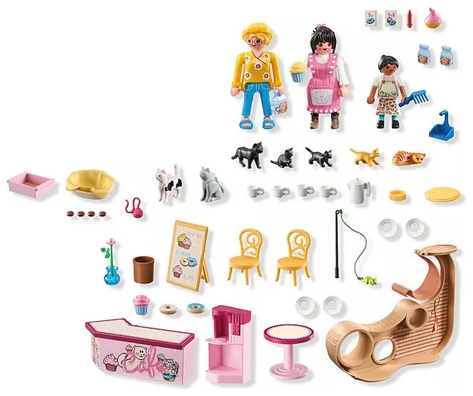 Επισκέπτες και γάτες νιώθουν πολύ άνετα στο χαριτωμένο καφέ γατών. Σερβίρονται cupcakes και ντόνατς με καφέ, ενώ μπορείτε να παίζετε με τις γάτες. Μεταξύ άλλων, οι γάτες τρέφονται και η τουαλέτα των γατών χρειάζεται και αυτή καθάρισμα. Ελάτε στην υπέροχη PLAYMOBIL Καφετέρια με γάτες, όπου ο καφές και οι αγκαλιές συναντιούνται! Οι επισκέπτες απολαμβάνουν cupcakes και καφέ σε ένα άνετο τραπέζι, ενώ οι παιχνιδιάρες γάτες εξερευνούν τον τοίχο αναρρίχησης, χαλαρώνουν στη κούνια ή κυνηγούν παιχνίδια. Με πολλές λεπτομέρειες όπως λεκάνη απορριμμάτων, στύλο γρατσουνίσματος και ακόμα και παιχνίδια για γάτες, η διασκέδαση για τους θαυμαστές των γατών δεν τελειώνει ποτέ! τρεις φιγούρες PLAYMOBIL, γάτες και πολλά αξεσουάρ Ηλικία: Από 4 ετών και άνω