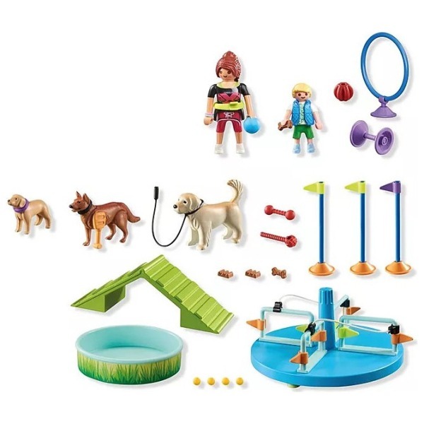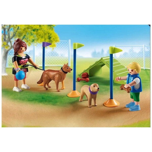 Η παιδική χαρά για σκύλους προσφέρει πολλές διαφορετικές δραστηριότητες για σκύλους και ιδιοκτήτες – από καρουσέλ για σκύλους μέχρι σλάλομ. Ακόμη και ένα σκυλάκι με προσθετικό πόδι μπορεί να παίζει ευχάριστα εδώ. Η διασκέδαση δεν τελειώνει ποτέ στο PLAYMOBIL Πάρκο σκύλων! Γυρίστε το καρουσέλ, τρέξτε το σλάλομ ή βουτήξτε στην πισίνα με μπάλες για ατελείωτη διασκέδαση. Προσαρμόστε τη διαδρομή με τις μπάρες από σιλικόνη, ρίξτε παιχνίδια ή τοποθετήστε την ράμπα για περιπέτειες γεμάτες ενέργεια. Το λουρί συνδέεται στη ζώνη της φιγούρας για διασκέδαση χωρίς χέρια. δύο φιγούρες PLAYMOBIL, τρία σκυλάκια και πολλά αξεσουάρ Ηλικία: Από 4 ετών και άνω