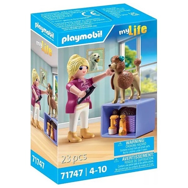 Ο κουρέας σκύλων εξασφαλίζει ότι η κυρία Poodle είναι άψογα περιποιημένη. Μεταμορφώστε την ώρα της περιποίησης σε ώρα παιχνιδιού! Κόψτε και βουρτσίστε τη γούνα της κυρίας Poodle ή προσθέστε διακοσμητικά κοκαλάκια στο τρίχωμά της για μια κομψή εμφάνιση. φιγούρα PLAYMOBIL, σκυλάκι, τραπέζι εργασίας, αποθηκευτικό κουτί, πιστολάκι, κουτί σπρέι, σαμπουάν, ξυριστική μηχανή, βούρτσα Ηλικία: Από 4 ετών και άνω