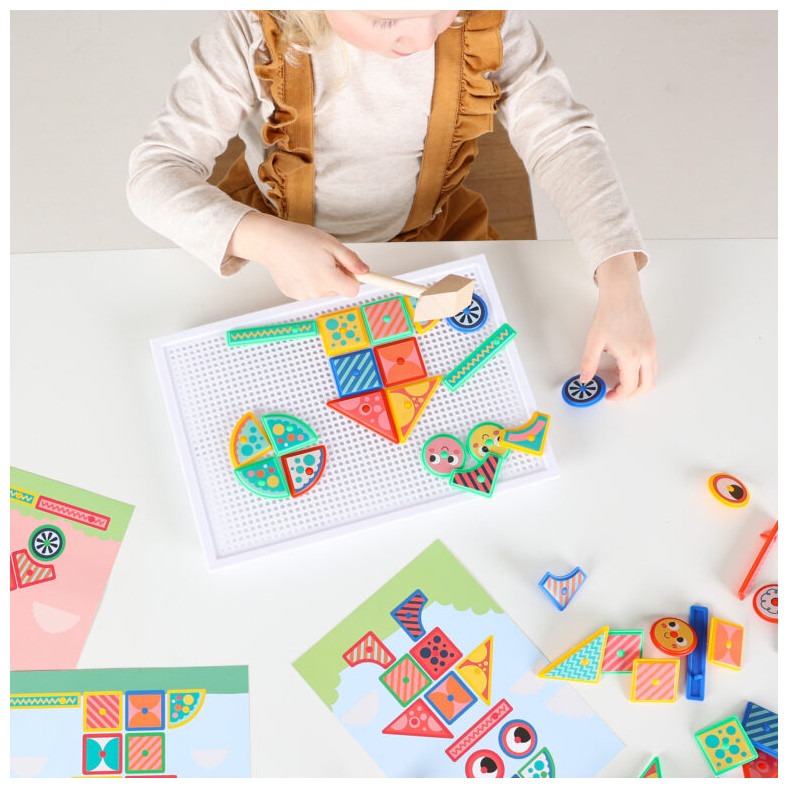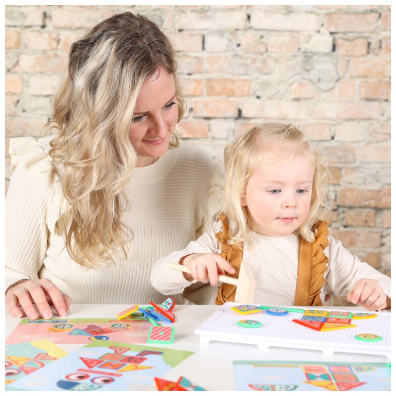 Ουάου, τι υπέροχο σετ! Αυτή η φανταχτερή εκδοχή του σφυριού-τικ περιέχει πολλές ξύλινες φιγούρες. Μπορείτε να αποθηκεύσετε τα σχήματα, τον χοντρό φελλό, τα στρογγυλεμένα καρφιά και το ξύλινο σφυρί στο ξύλινο κουτί αποθήκευσης με συρόμενο καπάκι. Χτυπήστε με το σφυρί και φτιάξτε τις δικές σας φιγούρες ή αντιγράψτε τις φιγούρες από τα παραδείγματα. Τα αυτοκόλλητα που παρέχονται προσθέτουν στη διασκέδαση! Πραγματικό ξύλινο σφυρί Μπορεί να χρησιμοποιηθεί ξανά και ξανά Ασφαλές χτύπημα με καρφιά Διεγείρει τη δημιουργικότητα Αναπτύσσει κινητικές δεξιότητες