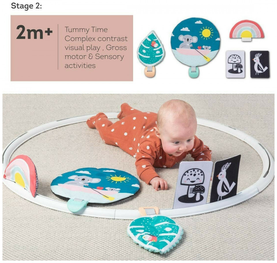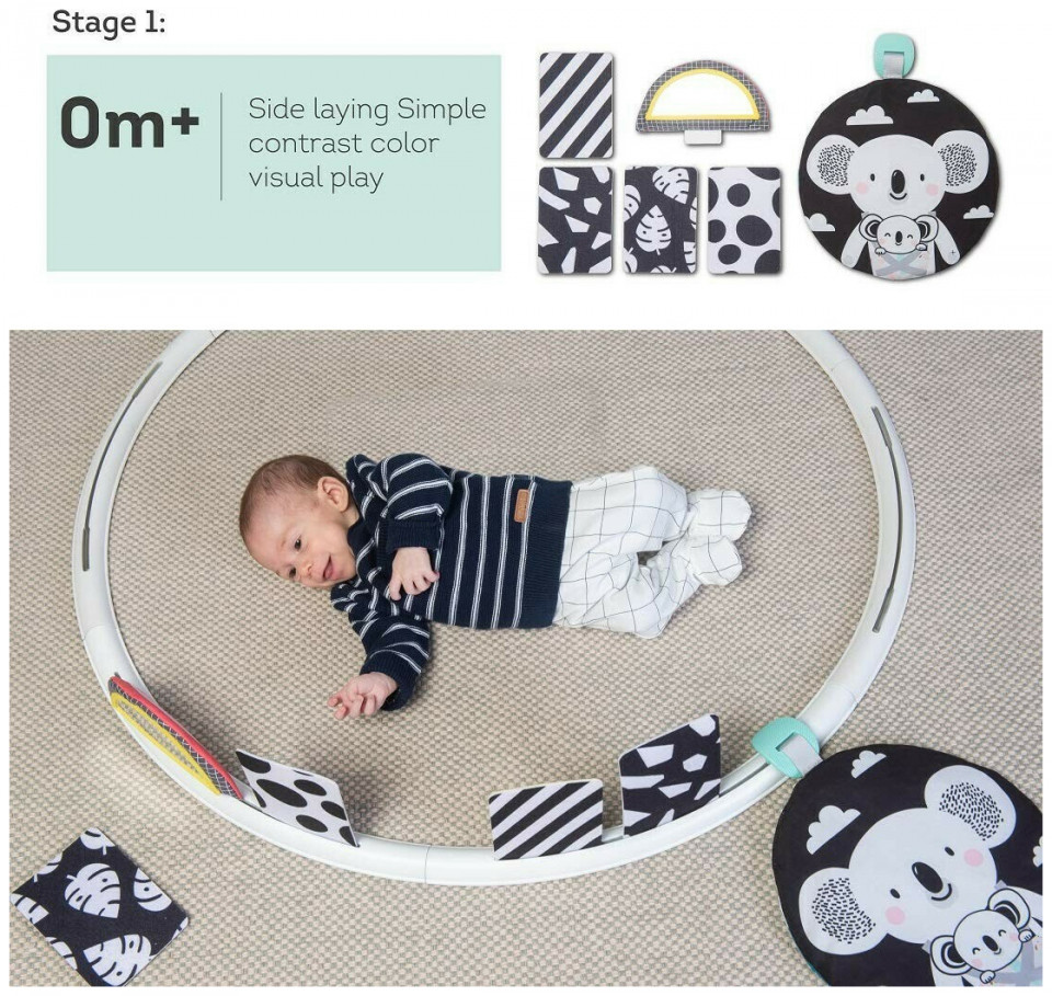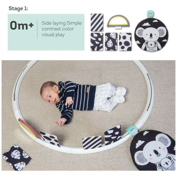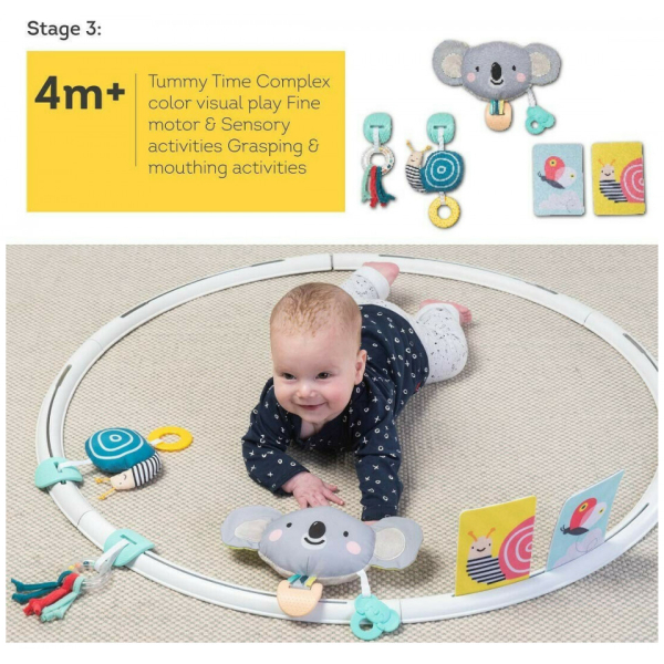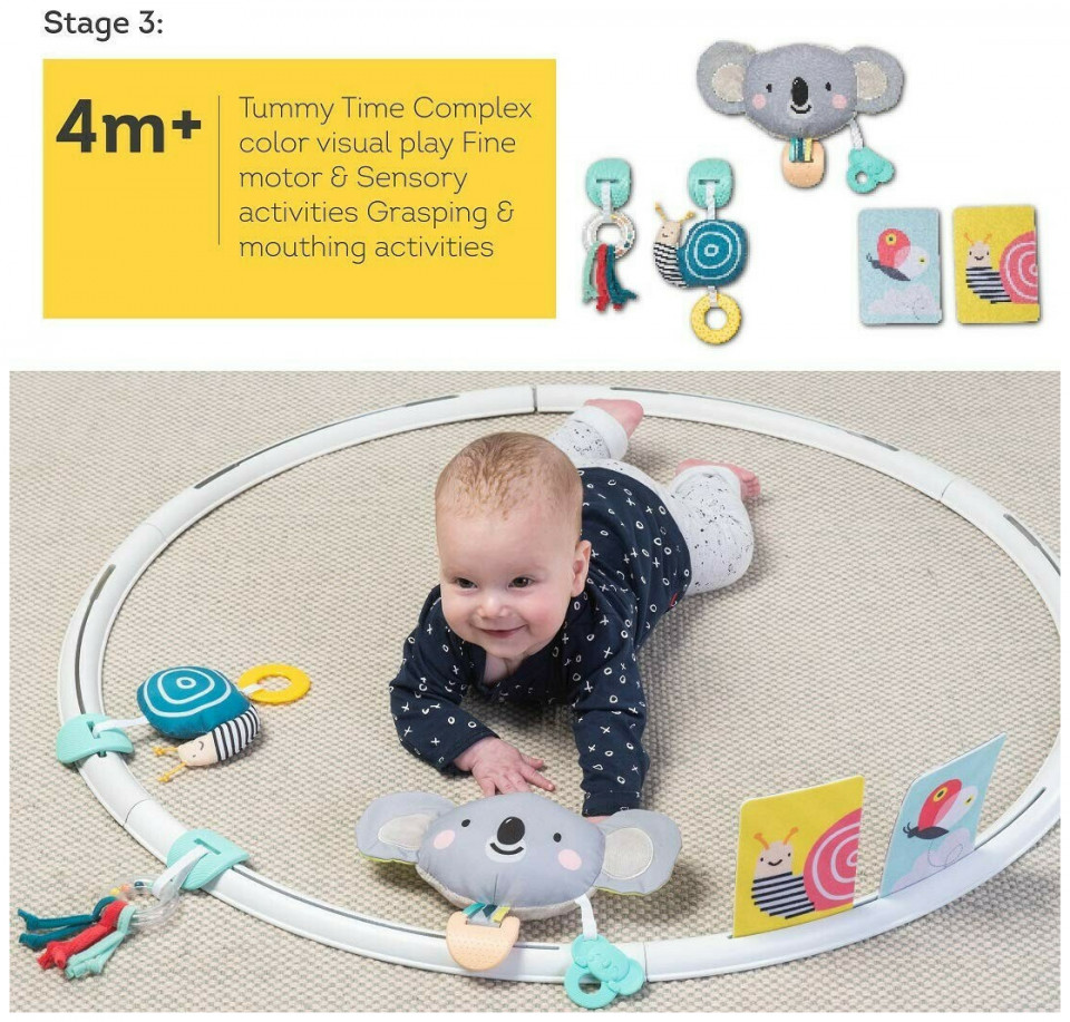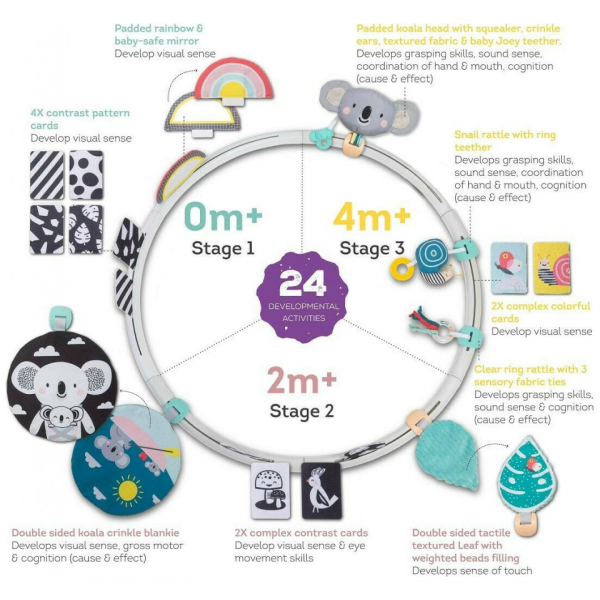 Χρειάζεται μόνο δύο λεπτά για συναρμολόγηση / αποσυναρμολόγηση – Το παιχνίδι είναι ελαφρύ και εύκολο να διπλωθεί και να αποθηκευτεί. 24 ΑΝΑΠΤΥΞΙΑΚΕΣ ΔΡΑΣΤΗΡΙΟΤΗΤΕΣ – ΑΙΣΘΗΤΗΡΙΑΚΑ ΑΠΟΣΠΩΜΕΝΑ ΠΑΙΧΝΙΔΙΑ – Διαθέτει ασφαλή βρεφικό καθρέφτη ουράνιο τόξο και τέσσερις εικονογραφημένες κάρτες , μαλακό πάνελ Koala διπλής όψης με κριτσανιστό γέμισμα και φύλλο με υφή γεμάτο με πλαστικές χάντρες , κουδουνίστρα κρίκο με κορδέλες, κουδουνίστρα σαλιγκάρι με κρίκο οδοντοφυΐας, ένα μαλακό παιχνίδι κοάλα με βελούδινα υφάσματα, χνουδωτό ύφασμα, κριτσανιστό, κορδέλες και ένα κρίκο οδοντοφυΐας σε σχήμα μωρό κοάλα . Το παιχνίδι με τα κρεμαστά παιχνίδια ενθαρρύνει την ανάπτυξη των αισθήσεων του μωρού, τις λεπτές και αδρές κινητικές του δεξιότητες και τον συντονισμό ματιών-χεριών. Το παιχνίδι είναι μέρος της συλλογής Koala Daydream, η οποία περιλαμβάνει μια μεγάλη ποικιλία προϊόντων που το μωρό μαθαίνει να γνωρίζει, να αναγνωρίζει και να αγαπά παντού όπου κι αν βρίσκεται. Διαστάσεις: – – Ø 90cm, Ø 35,5 “.