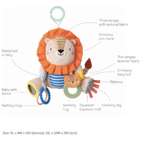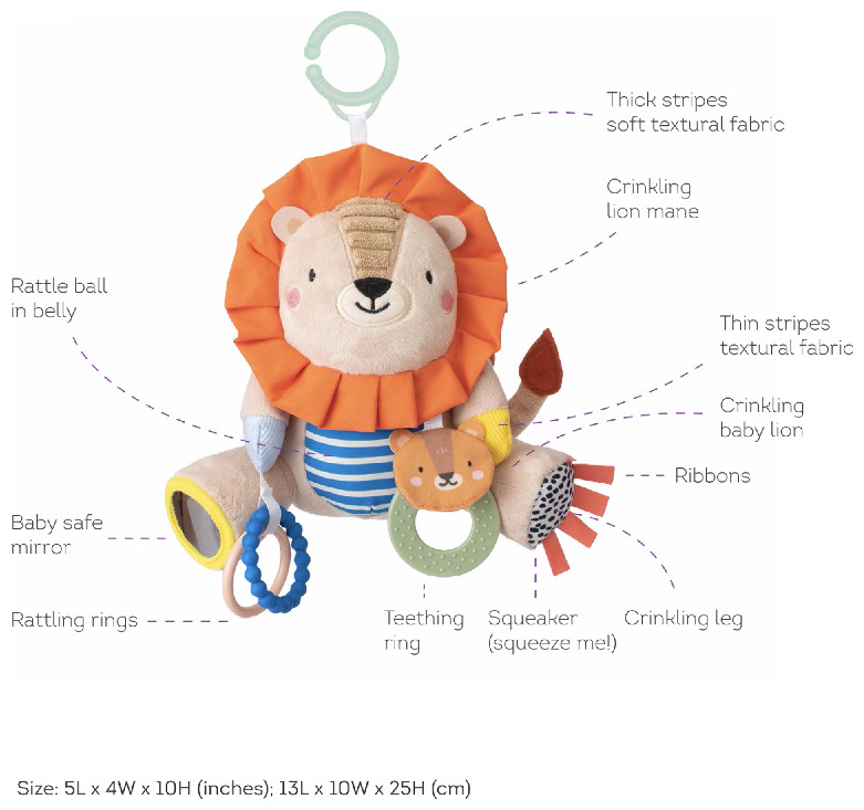 Παιχνίδι με τη μορφή του αξιολάτρευτου λιονταριού Χάρι για χρήση σε κούνια, καρότσι, κάθισμα αυτοκινήτου κ.λπ. Το παιχνίδι κουδουνίζει, θροΐζει και προσφέρει μια ποικιλία από υφές για εξερεύνηση με τα χέρια και το στόμα του μωρού. Οι πλαστικοί δακτύλιοι χρησιμεύουν επίσης ως οδοντογλυφίδες.Αναπτύσσει τις λεπτές κινητικές δεξιότητες και τις αισθήσεις του παιδιού. Τα Taf Toys έχουν σχεδιαστεί για να αναπτύσσουν τη συναισθηματική νοημοσύνη του παιδιού, η οποία είναι βασικό κλειδί για την υγιή προσωπικότητα και την αυτοπεποίθηση ενός παιδιού.Διαστάσεις: 25 x 13 x 10 cm.Κατάλληλο για παιδιά από τη γέννηση.