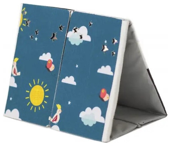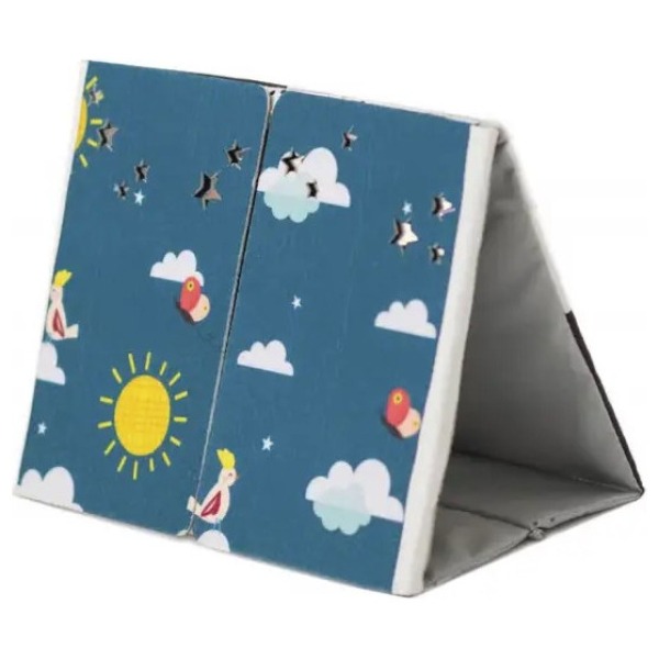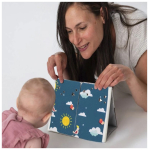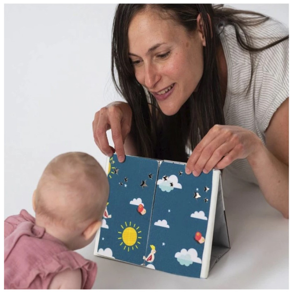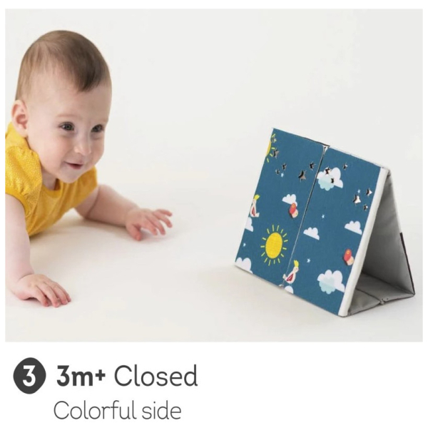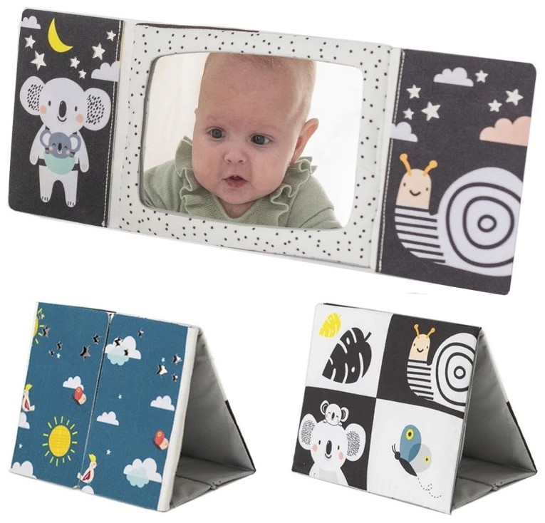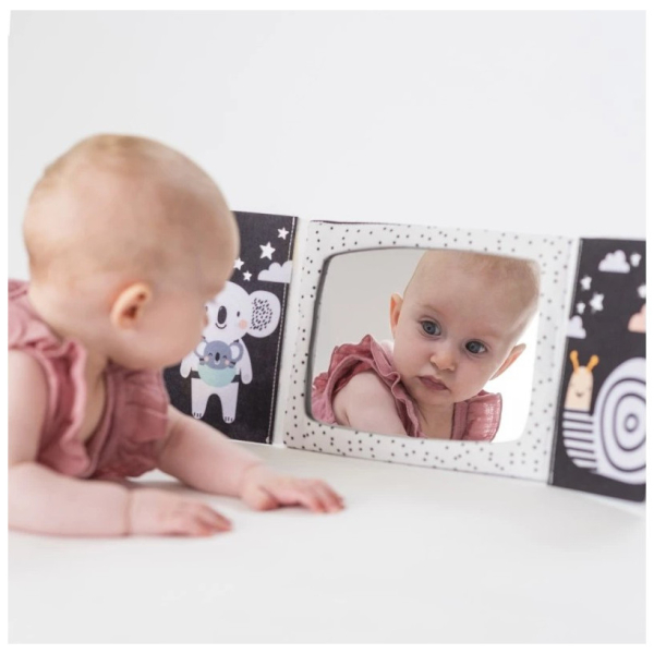 Το υφασμάτινο βιβλίο σε σχήμα επιτραπέζιου ημερολογίου είναι ιδανικό για να το τοποθετήσετε μπροστά στο παιδί ενώ παίζει στην κοιλιά του. Οι ακαταμάχητες εικόνες υψηλής αντίθεσης και ένας ασφαλής, μεγάλος καθρέφτης προσελκύουν την προσοχή του μωρού και βοηθούν το μωρό να διασκεδάζει ενώ παίζει με την κοιλιά του.Ο καθρέφτης βοηθά το παιδί να μάθει την αυτογνωσία και διεγείρει την ανάπτυξη της όρασης και των επικοινωνιακών του δεξιοτήτων. Ο καθρέφτης που καλύπτεται από πτερύγια βιβλίων μπορεί επίσης να χρησιμοποιηθεί για το δημοφιλές παιχνίδι γονέα-παιδιού του κρυφτού Peek-A-Boo.Το βιβλίο προσφέρει δύο τύπους εικόνων για δύο αναπτυξιακά στάδια του παιδιού: 0-3 μήνες: ασφαλής καθρέφτης και απλές εικόνες υψηλής αντίθεσης Από 3 μηνών: ζωντανές έγχρωμες εικόνες Διαστάσεις: 18,5 x 13,5 cm Κατάλληλο για παιδιά από τη γέννηση.