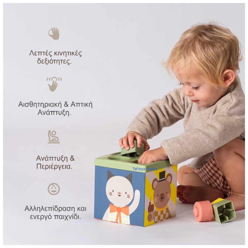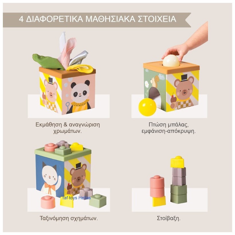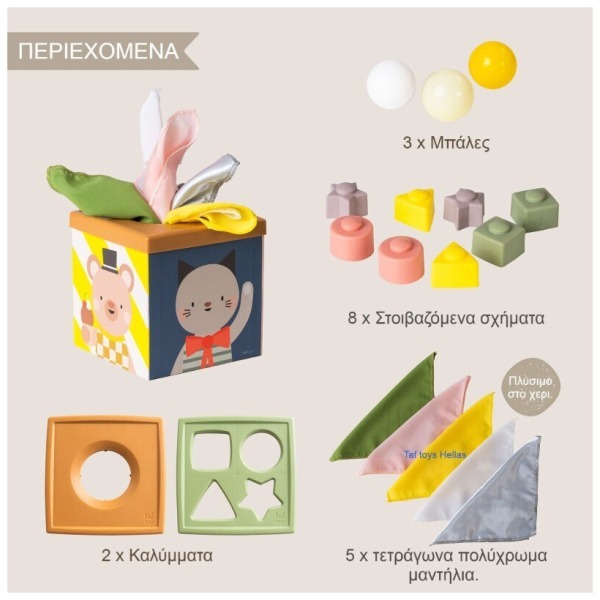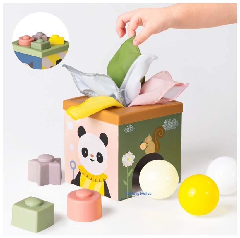Ένας πολύχρωμος και πολυαισθητηριακός κύβος δραστηριοτήτων σχεδιασμένος για νήπια από 12 μηνών και άνω. Προάγει τη γνωστική ανάπτυξη, την ενίσχυση των κινητικών δεξιοτήτων και το ανεξάρτητο παιχνίδι. Χαρακτηριστικά: Ηλικία: Από 12 μηνών και άνω Διαστάσεις: 14.5 x 14.5 x 19.5 cm Υλικά: Μη τοξικά, χωρίς BPA, μόλυβδο, φθαλικές ενώσεις και υδράργυρο Δραστηριότητες: Πέντε πολύχρωμα μαντηλάκια για εξερεύνηση υφής Τρεις μαλακές μπάλες για ανάπτυξη αισθητηριακών ικανοτήτων Οκτώ στοιβαζόμενα σχήματα για ενίσχυση της επίλυσης προβλημάτων Σχεδιασμός με στρογγυλή οπή και καλύμματα για αντιστοίχιση σχημάτων, που προσφέρει ατελείωτες ευκαιρίες εξερεύνησης και ανακάλυψης