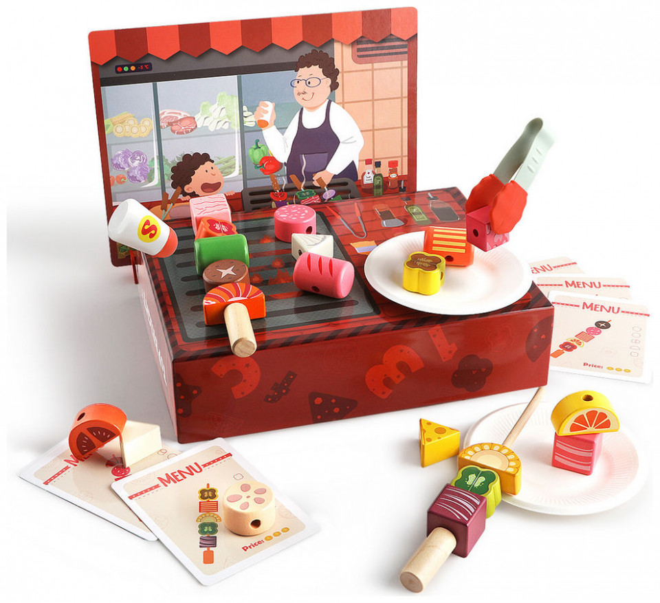 Προσποιηθείτε ότι είστε ιδιοκτήτης καταστήματος μπάρμπεκιου. Το ξύλινο σετ ψησταριάς & μπάρμπεκιου γκριλ είναι κατασκευασμένο από μη τοξικά, φιλικά προς το περιβάλλον υλικά,Το λείο άκρο εξασφαλίζει ασφάλεια για τα χέρια των μικρών παιδιών.