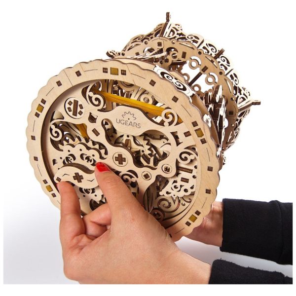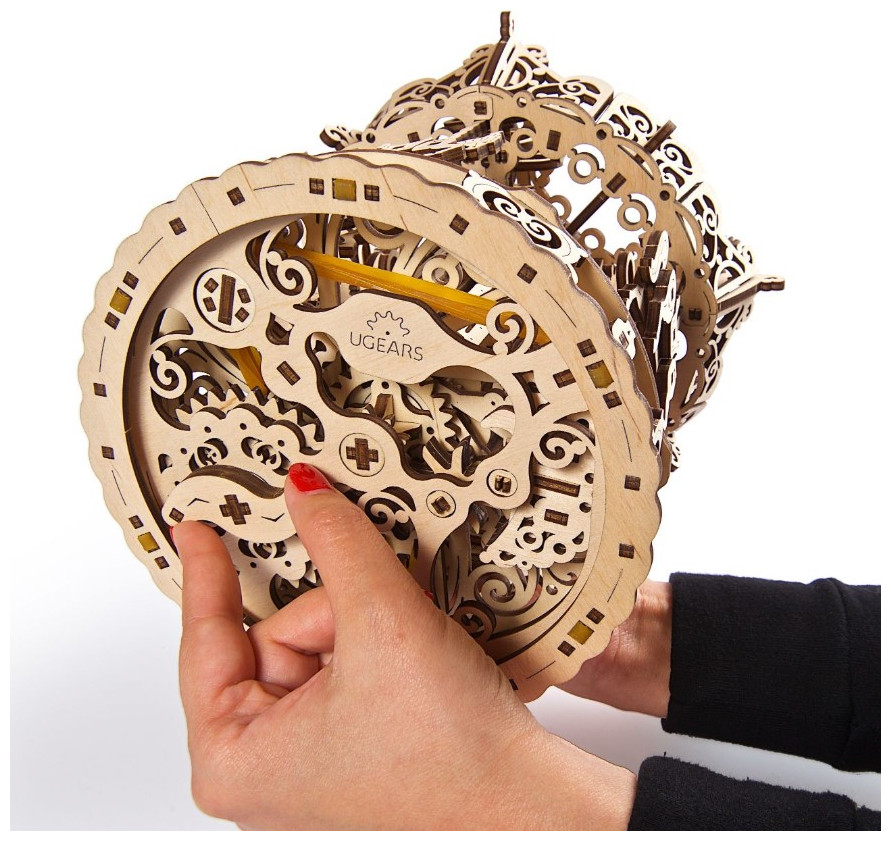 Round and round and back to where it’s all begun… Take a trip to your childhood memories with Ugears beautiful nostalgic model, the Carousel. This outstanding model is a Ugears look at the classic merry-go-round implemented in top-quality wood, the familiar and beloved fairground ride is presented with highly-detailed design. Here you will find two types of carousel horses that rock up and down as the model spins. The core of the model is a center pole that rotates in a direction opposite to the main platform making it look as if the carousel spins faster than it really does and creates the fascinating dynamics of the whole construction. The pole rises over the roof making it visually more delicate and at the same time giving it more volume. Add little birds soaring over the roof of the carousel along with decorative flying lanterns and you may just sense the aroma of hot dogs and cotton candy! As for the technical aspects, the Ugears Carousel is based on the same principle as most Ugears self-propelled models: all parts of the puzzle are joined without glue or additional tools and the motion energy is provided by a rubber band motor. The Carousel has a wind-up key under its base that provides tension to the rubber bands attached to the main axle. The pendulum gears down the axle and makes the movement of the modules and details smoother. The main axle is connected to the central pole via the planetary gear that ensures that it rotates in the direction opposite to the main platform. The roof is also attached to the main axle and crankshafts that make the horses go up and down while spinning around the central pole. It is great fun to observe the model in motion, but if you are one of those people who like to see with their hands, you can rotate the Carousel manually. This will allow you to examine every detail in slow motion and give you a full comprehension of how the mechanism works. Made of sustainable high-grade wooden materials, Ugears Carousel is a perfect gift for someone who wants to turn away from daily stress and for a few hours feel the carefree magic of the fair. Put it together, wind it up and we guarantee you will hear that music, feel the buzzing atmosphere of the holiday fair, and remember how much joy it was to ride your favorite horse on its happy round and round trip! Διαστάσεις μοντέλου: 8.3*8.3*10.2 in (21*21*26 cm) Διαστάσεις πακέτου: 14.6*6.7*1.7 in (37.8*17*4.2 cm) Αριθμός εξαρτημάτων:305 Εκτιμώμενος χρόνος συναρμολόγησης: 6 ώρες Επίπεδο δυσκολίας: Μεσαίο