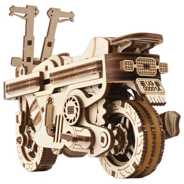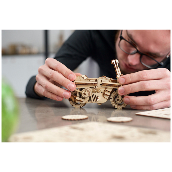Το 3D παζλ αναδιπλούμενου σκούτερ Moto Compact έχει αρκετή δύναμη για το μέγεθός του. Το ξύλινο μοντέλο σκούτερ οδηγείται από έναν κινητήρα ελατηρίου και μπορεί να διασχίσει 2 μέτρα ( έξι πόδια) με ένα μόνο καρούλι. Το τιμόνι μπορεί να τοποθετηθεί σε μία από τις τρεις θέσεις για να στείλει το Moto σας σε ευθεία διαδρομή ή κυρτή πορεία προς τα αριστερά ή προς τα δεξιά. Επειδή πρόκειται για μοντέλο Ugears και επειδή απολαμβάνουμε να πακετάρουμε όσο το δυνατόν περισσότερη μηχανική δράση στα ξύλινα μοντέλα μας DIY, το Moto Compact διαθέτει εξαιρετικά χαρακτηριστικά, συμπεριλαμβανομένης της εμπρός και πίσω ανάρτησης και εξελιγμένη ικανότητα αναδίπλωσης για ασφαλή και εύκολη μεταφορά. Για να διπλώσετε το Moto Compact, πιάστε τα μπροστινά και τα πίσω τμήματα του ποδηλάτου και σπρώξτε τα μαζί. Το διπλωμένο σκούτερ μπορεί τώρα να χωθεί σε μια τσέπη και να μεταφερθεί ή μπορεί να στηριχτεί στο σταντ του. Για να βάλετε μπρος το σκούτερ, πιάστε και τραβήξτε ελαφρά τα εμπρός και τα πίσω τμήματα, πράγμα που ανεβάζει το τιμόνι. Πιέστε το κάθισμα του οδηγού προς τα κάτω για να ενεργοποιήσετε τον μηχανισμό «stop». Τώρα μπορείτε να τυλίξτε τον κινητήρα χρησιμοποιώντας το κουμπί καστάνιας στη δεξιά πλευρά του ποδηλάτου. Σηκώστε τη βάση και κατεβάσετε τους μικρούς τροχούς οδήγησης από κάτω για εξισορρόπηση. Τοποθετήστε το ποδήλατο στο πάτωμα ή σε άλλη λεία επιφάνεια και, στη συνέχεια, κρατήστε το ελαφρά ενώ πιέζετε το πίσω κάθισμα του συνοδηγού, το οποίο χρησιμεύει ως κουμπί “εκκίνησης”. Αυτό το πράγμα σηκώνει το κάθισμα του οδηγού και ενεργοποιεί την κύρια ταχύτητα – ξεκινήστε γρήγορα και παρακολουθήσετε το σκούτερ σας! Αφού σταματήσει το σκούτερ, αν θέλετε να το ξεκινήστε ξανά, απλώς επαναλάβετε τον κύκλο. Αριθμός εξαρτημάτων: 192 Μέγεθος μοντέλου: 5,7*2,4*4,3 σε (14,5*6,2*11cm) Μέγεθος συσκευασίας:14,9*6,7*1,06 σε (37,8*17 *2,7cm) Εκτιμώμενος χρόνος συναρμολόγησης: 4 ώρες