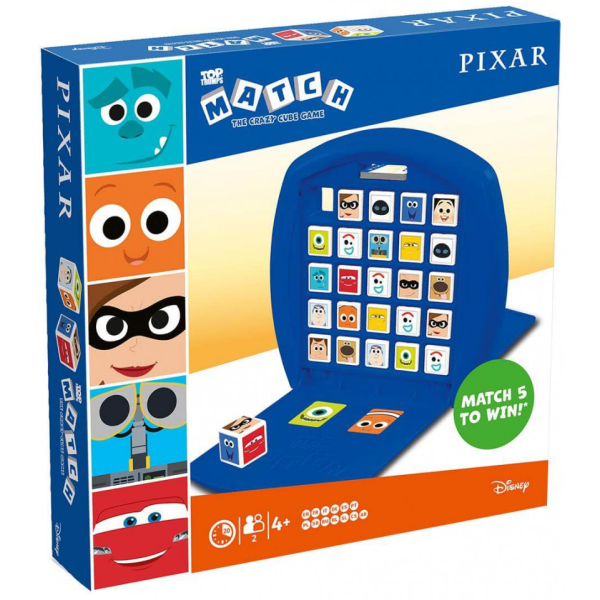 Παίξτε με 15 διαφορετικούς χαρακτήρες όπως ο Mike και ο Sulley, ο WALL-E και η EVE, ο Buzz, ο Woody και ο Nemo καθώς ανταγωνίζεστε για να φτιάξετε μια γραμμή των πέντε πριν από τον αντίπαλό σας. Σπρώξτε έναν κύβο για να χτυπήσετε έναν άλλο, δημιουργήστε τη δική σας γραμμή και ταυτόχρονα διακόψτε τη γραμμή του αντιπάλου σας. Αλλά προσέξτε – αν το φύλλο του αντιπάλου σας ταιριάζει με τη γραμμή σας, μπορεί να κλέψει τη νίκη! Με 25 κύβους και ένα πακέτο 15 καρτών χαρακτήρων, ολόκληρο το παιχνίδι είναι εύκολο να αποθηκεύτεί, χάρη στη θήκη μεταφοράς all-in-one. Ήρθε η ώρα να ξαναζήσετε μερικές κλασικές περιπέτειες κινουμένων σχεδίων και να αποκτήσετε ένα μικρό κομμάτι της κινηματογραφικής ιστορίας με το Pixar Top Trumps Match. Βασικά χαρακτηριστικά Το παιχνίδι Crazy Cube παίρνει μια ανατροπή της Disney και της Pixar! Γίνετε ο πρώτος που θα ταιριάξει πέντε από αυτούς τους καταπληκτικούς χαρακτήρες στη σειρά – οριζόντια, κάθετα ή διαγώνια Αλλά περίμενε! Μπορεί ο αντίπαλός σου να κλέψει το παιχνίδι; Γυρίστε την κάρτα Top Trump για να αποκαλύψετε εάν μπορούν να πάρουν τον αγώνα και να κερδίσουν το παιχνίδι Παίξτε με 15 χαρακτήρες, συμπεριλαμβανομένων των Lightning McQueen, Mr. Incredible και Dory Εύκολη εγκατάσταση και συσκευασία, το Top Trumps Match διατίθεται σε μια εύχρηστη αυτόνομη πλαστική θήκη – παίξτε οποτεδήποτε, οπουδήποτε